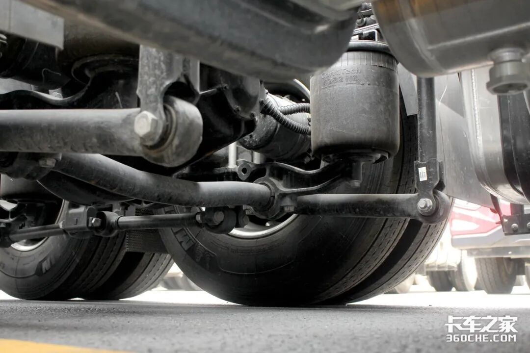 这款跨越V7的底盘采用前2片钢板弹簧+后8气囊悬架设计,气囊来自德国马牌,产品质量有所保证;双后桥的整体升降可以提升甩挂运输的效率,如果空车行驶,单桥提升后行驶可以减少轮胎磨损,降低油耗;因此,8气囊的设计对于干线运输来说,在节能和效率上都有一定的表现。