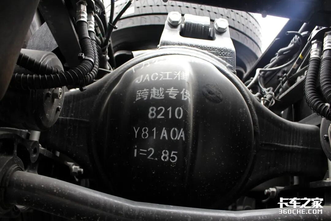 这是一根速比为2.85的江淮跨越专用高端后桥,可以选装更小的2.64速比,大马力+小速比后桥的组合非常适合干线物流运输,可以使得经济车速高、减少油耗,而后桥的保养里程同样达到10万公里。