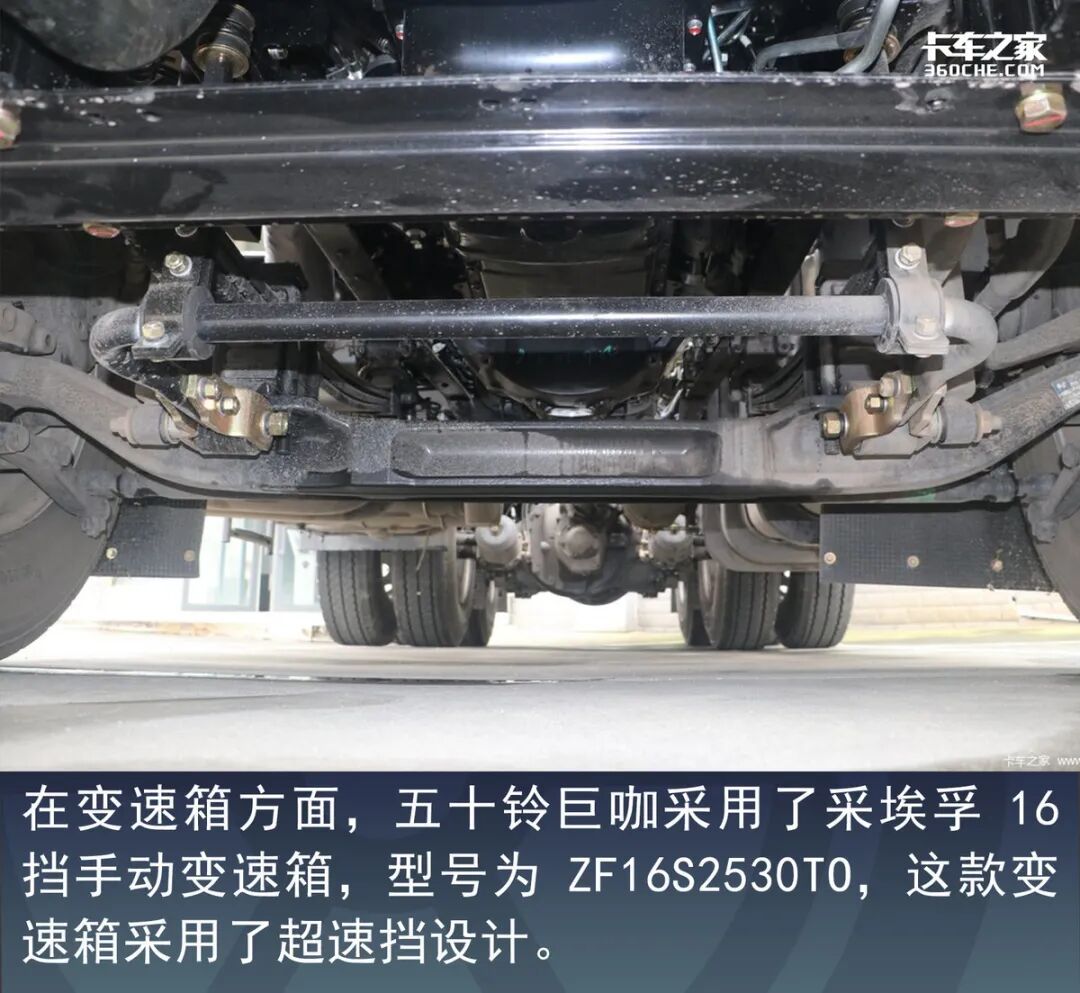 在变速箱方面,五十铃巨咖采用了采埃孚16挡手动变速箱,型号为ZF16S2530TO,这款变速箱采用了超速挡设计,头挡速比13.8,最高挡速比为0.84。这款变速箱采用了同步器设计,换挡轻松流畅,能为司机节约不少精力。作为广受认可的变速箱品牌,采埃孚变速箱的传动效率非常高,在燃油经济性以及换挡逻辑上的表现也都让人比较满意。