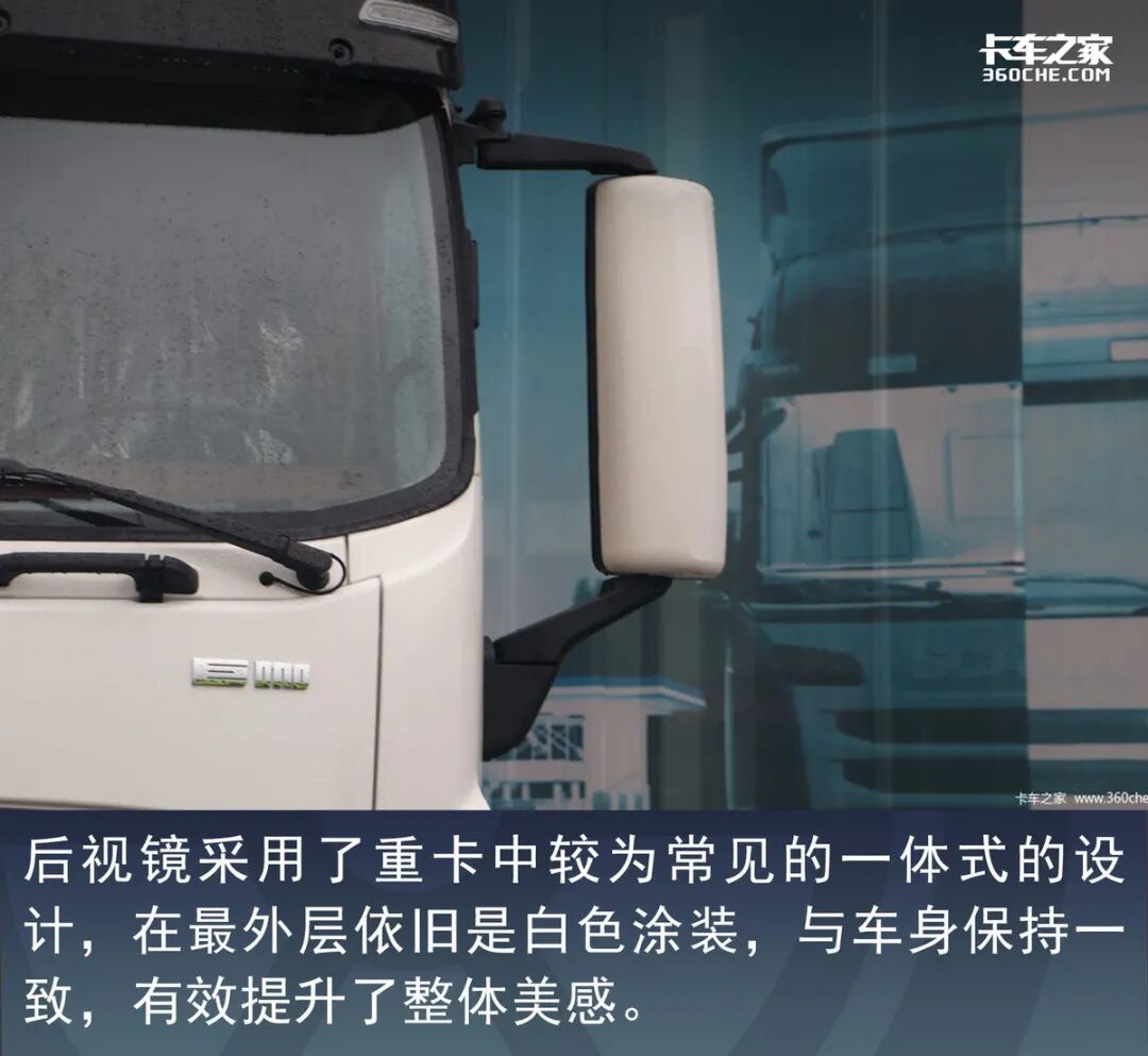 后视镜采用了重卡中较为常见的一体式的设计,在最外层依旧是白色涂装,与车身保持一致,有效提升了整体美感。并且一体式设计的后视镜在高速行驶时,还能起到降风阻的效果。