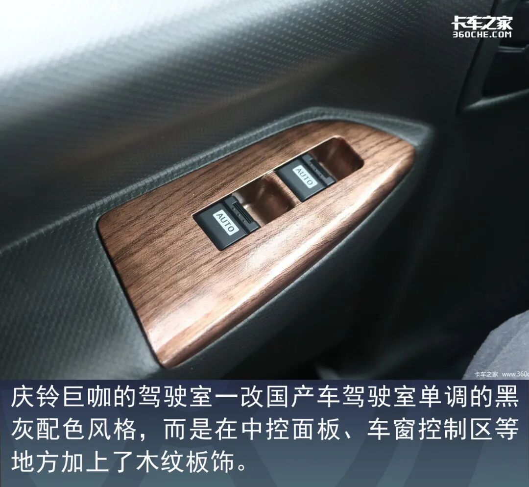 都说现在国产车的高端化趋势明显,尤其是在车辆的内饰配置上最能直观的体现,庆铃巨咖的驾驶室一改国产车驾驶室单调的黑灰配色风格,而是在中控面板、车窗控制区等地方加上了木纹板饰。
