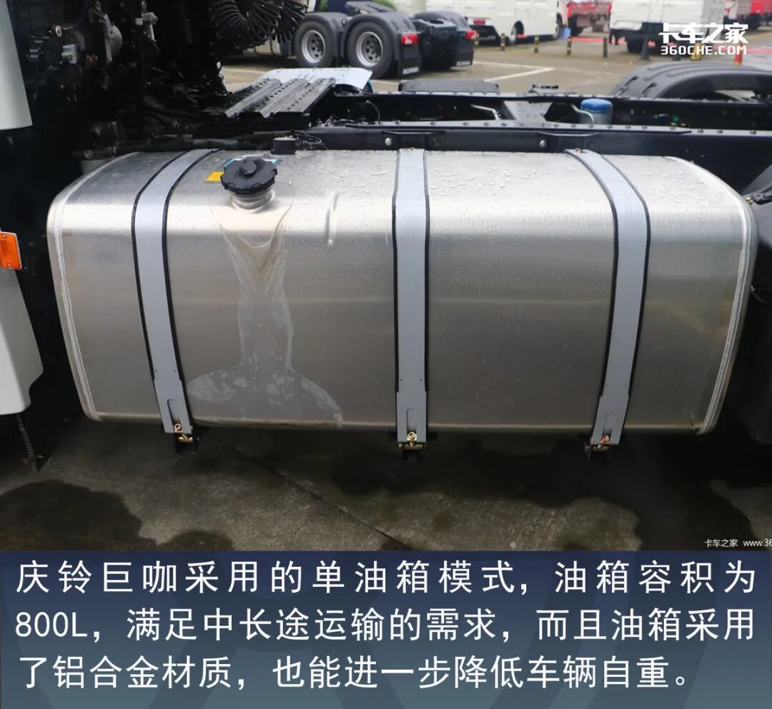 续航方面,庆铃巨咖采用的单油箱模式,油箱容积为800L,满足中长途运输的需求,而且油箱采用了铝合金材质,也能进一步降低车辆自重。