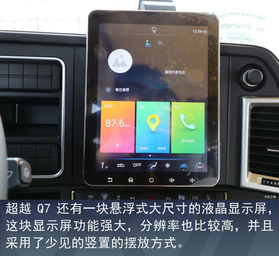 值得一提的是,超越Q7还有一块悬浮式大尺寸的液晶显示屏,这块显示屏功能强大,分辨率也比较高,并且采用了少见的竖置的摆放方式,看起来更像是一个大号的手机。在使用驾驶时使用导航等功能会更好操作。