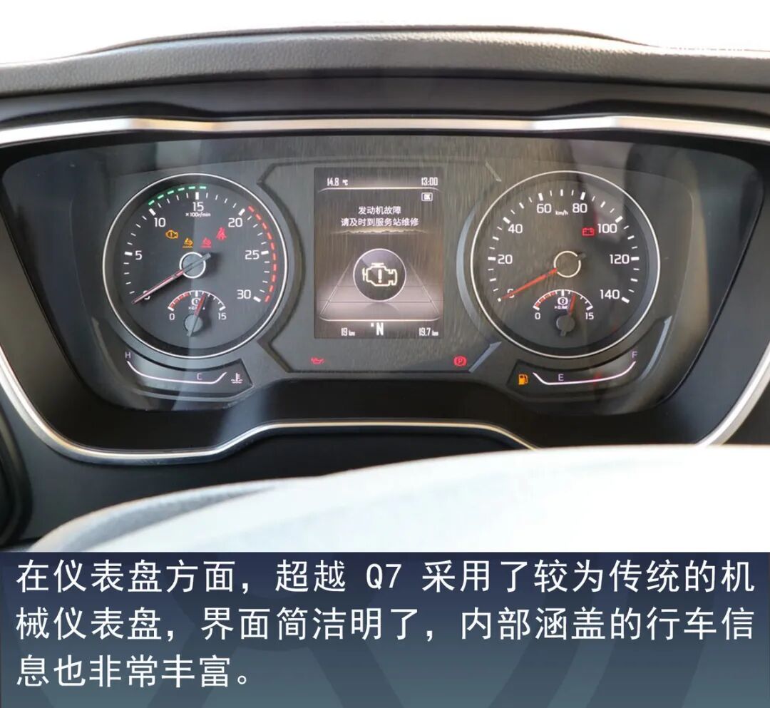 在仪表盘方面,超越Q7采用了较为传统的机械仪表盘,界面简洁明了,内部涵盖的行车信息也非常丰富。