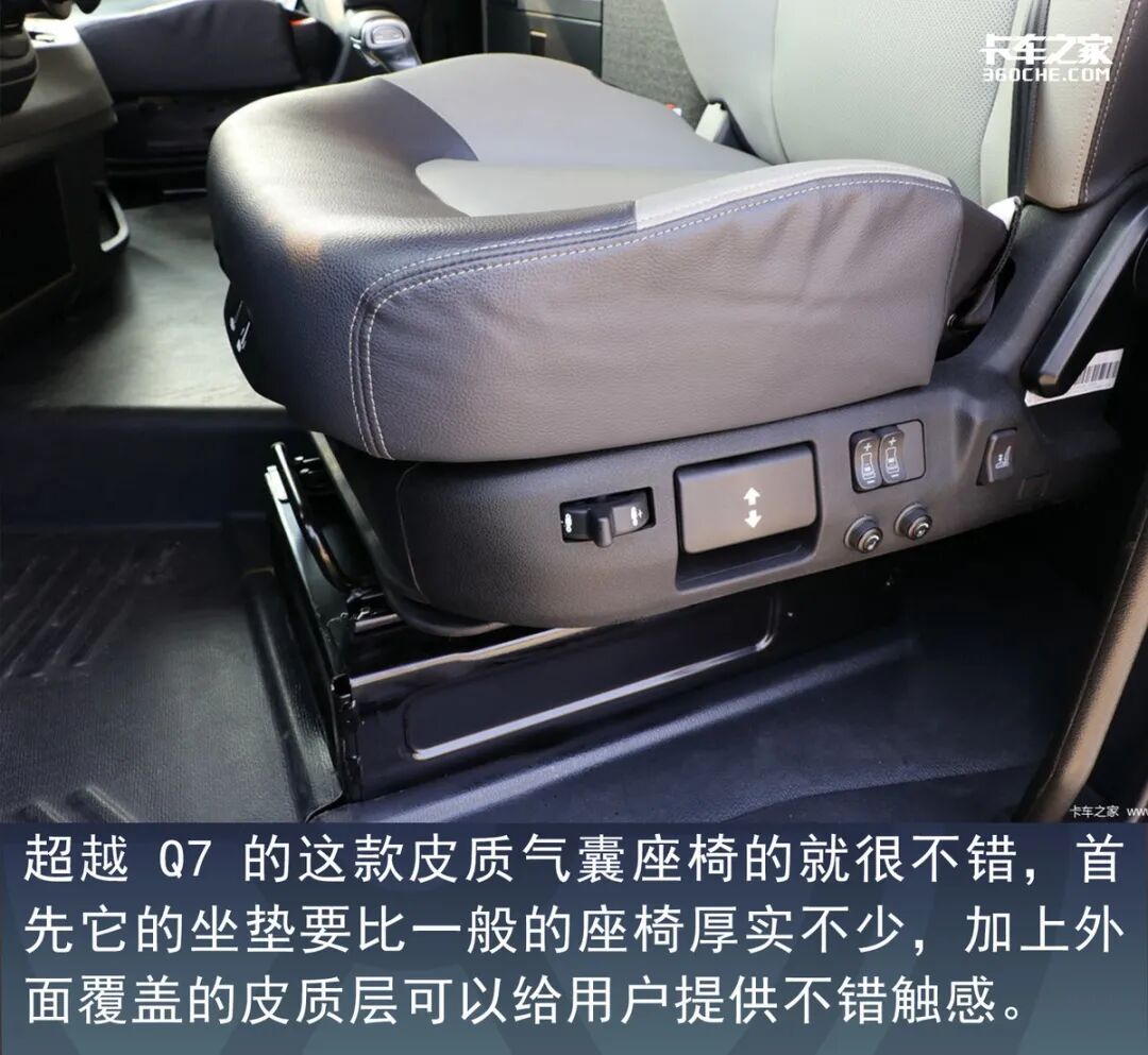 超越Q7装配的是一个全新的高顶平地板驾驶室,驾驶室采用了四点气囊悬挂,减震性会更好,能够有效的保障驾驶室的稳定性。得益于高顶平地板的设计,超越Q7驾驶室可以为驾乘人员营造更大的内部空间,无论是内部高度还是主副驾座椅间隙都非常充裕,司机在驾驶室里完全可以做到行动自如。