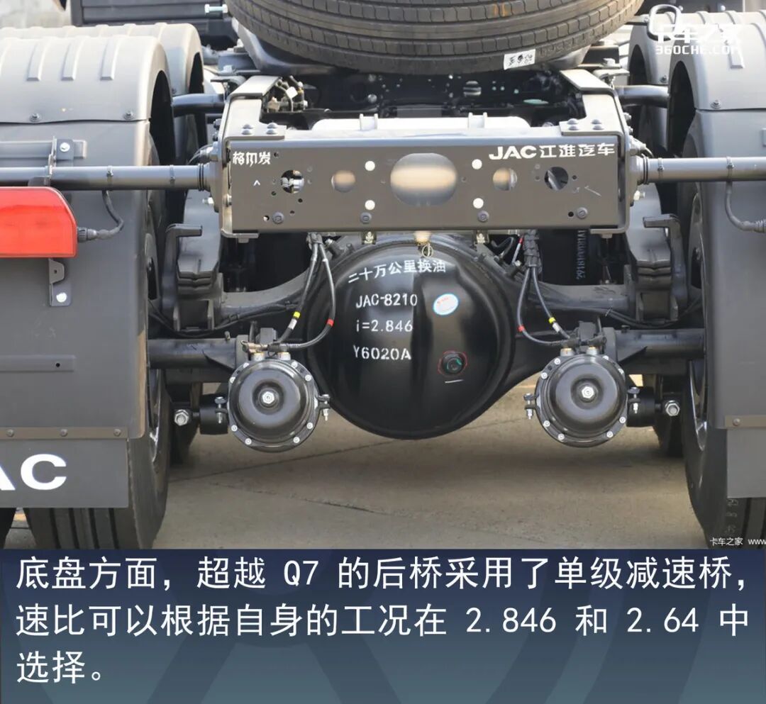 底盘方面,超越Q7的后桥采用了单级减速桥,速比可以根据自身的工况在2.846和2.64中选择。小速比配合上560马力的强劲动力输出可以满足用户高时效的追求。20万公里长换油设计降低了维护频率,提高了车辆的出勤率。