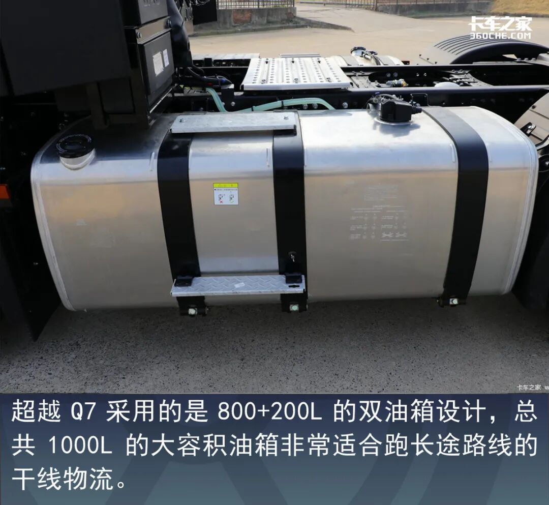 超越Q7采用的是800+200L的双油箱设计,总共1000L的大容积油箱非常适合跑长途路线的干线物流,减少加油次数,节约运输时间。全铝合金外壳的油箱也能够帮助车辆进一步降低自重。