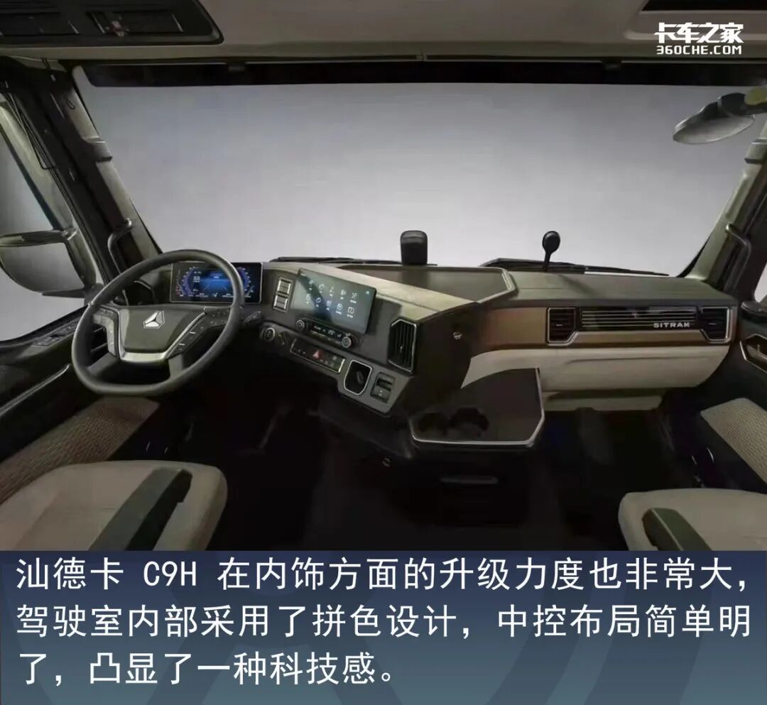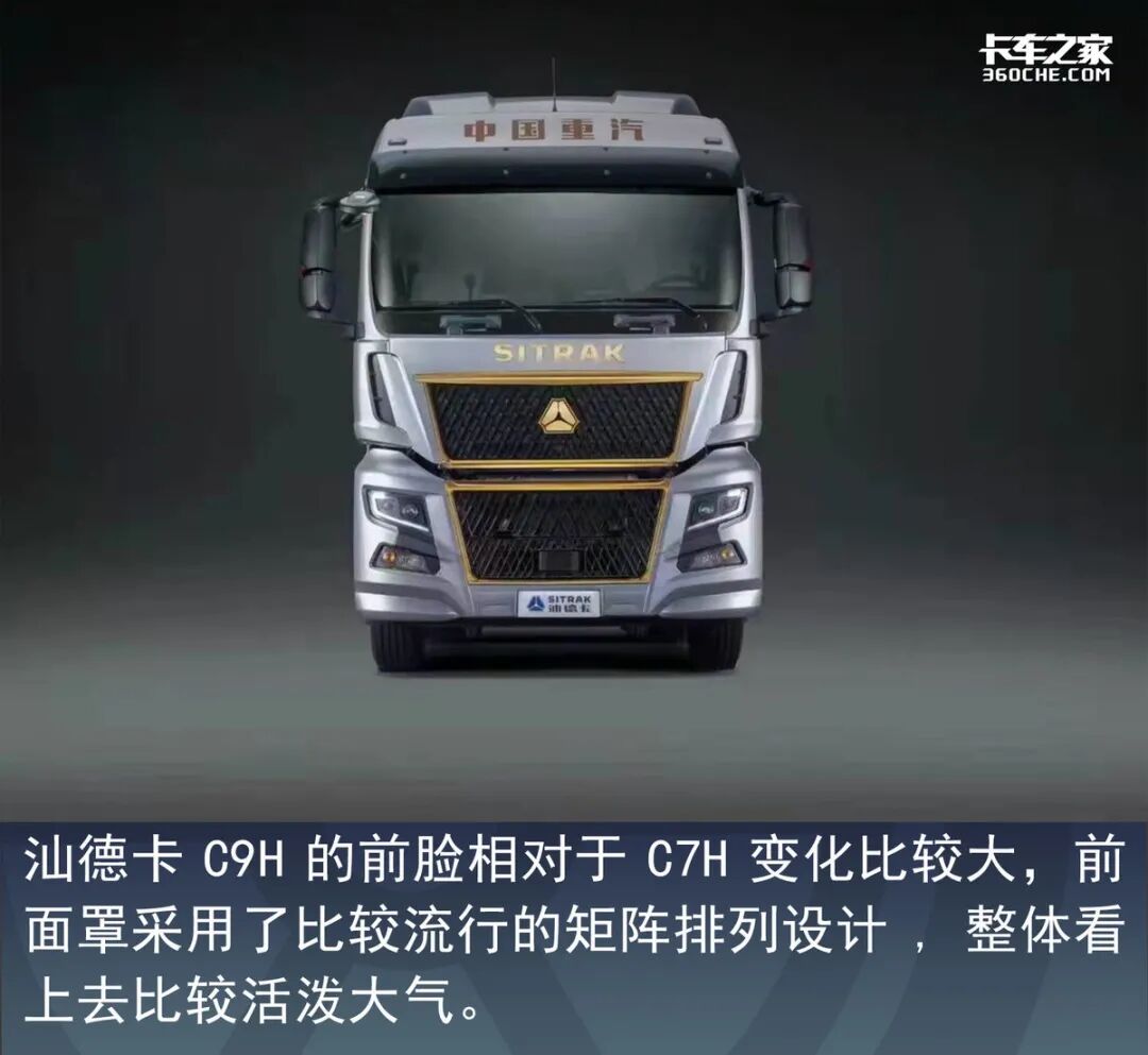 整体来看,C9H的车身线条更加明显,从前挡风玻璃两侧一直延伸到保险杠最下端,形成了一个“U”型设计。扰流板与面板之间采用了一些曲线设计作为连接,看起来更具层次感。而且面板上的汕德卡字母、重汽LOGO甚至进气格栅的边框都采用鎏金配色,显示了这款车的高端属性。