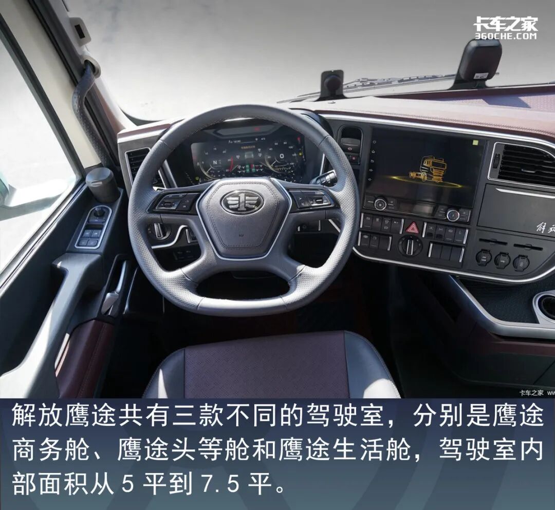 解放鹰途的驾驶区域采用了红色和黑色双拼设计,给人一种温馨的感觉,同时还更加具有科技感。头等舱和生活舱采用的是仿木地板,商务舱则是绒布地板。用户可以根据自己的需求进行选择。