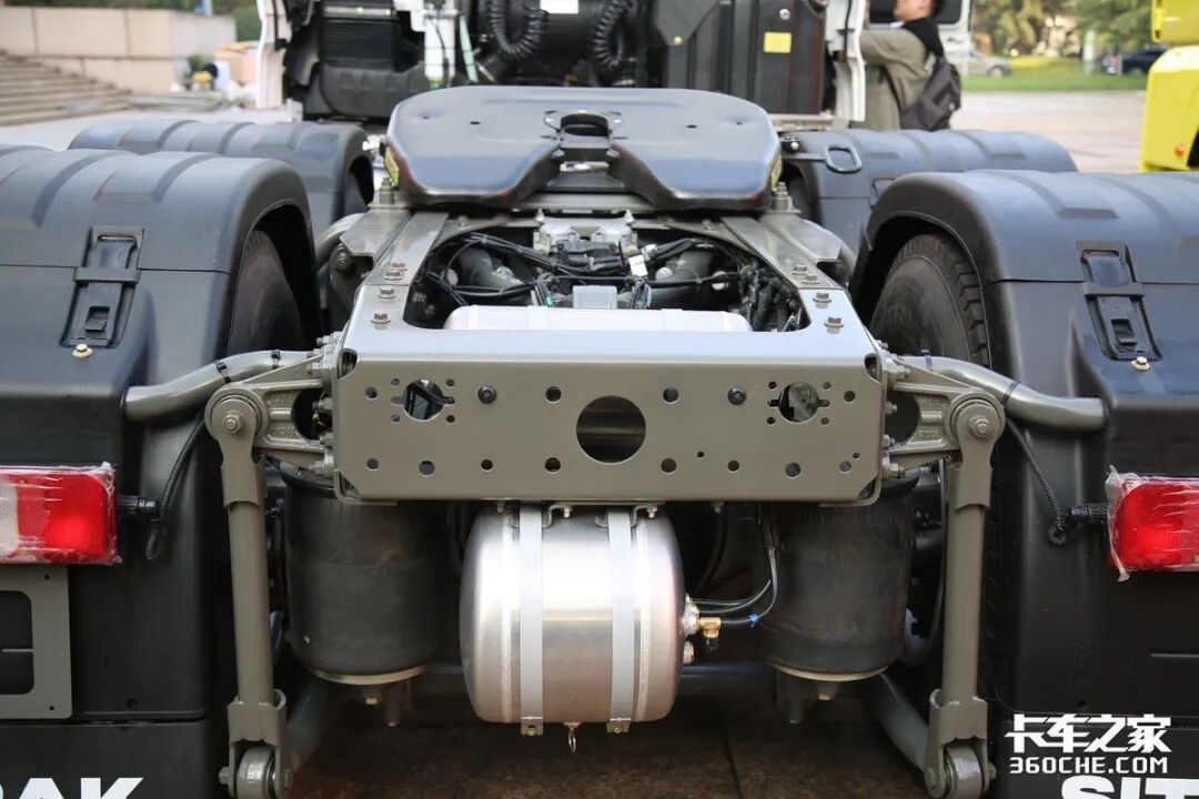 全车铝合金车轮、前桥固特异轮胎、原厂的侧裙板、1290升大油箱,底盘配置十分酷炫。在底盘方面,实拍车型采用了前钢板后气囊的悬架设计,能够适应高效物流中的甩挂运输,后桥采用MCY12BES后桥,速比为2.71,根据卡车之家车速计算器模拟计算,在1000-1400rpm区间内,其最高时速可达70-98km/h,比较高效。