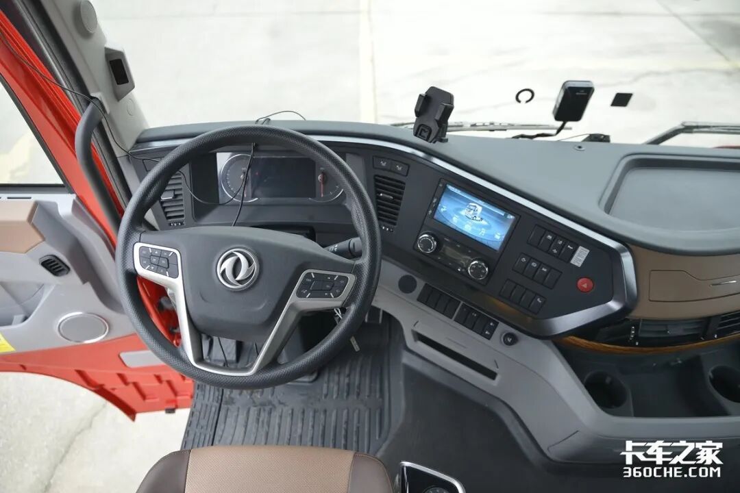 内饰方面,天龙KX的平地板高顶双卧驾驶室空间非常宽大,即便是两位卡友参与运输都能轻松应对。同时配置非常丰富,多功能方向盘、液晶仪表、中控大屏、自动空调、疲劳驾驶监测、原厂手机支架、小桌板等等配置,换挡机构也集成在了主驾座椅右边,操控更加方便。