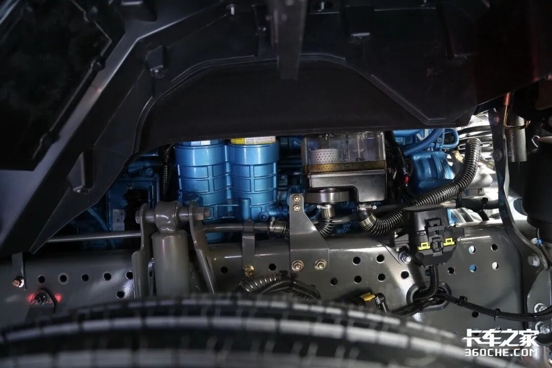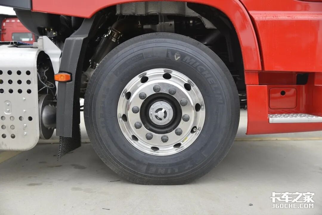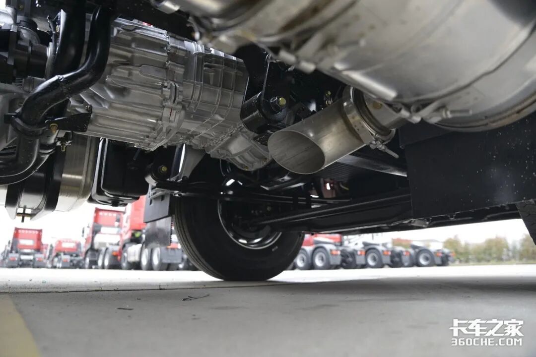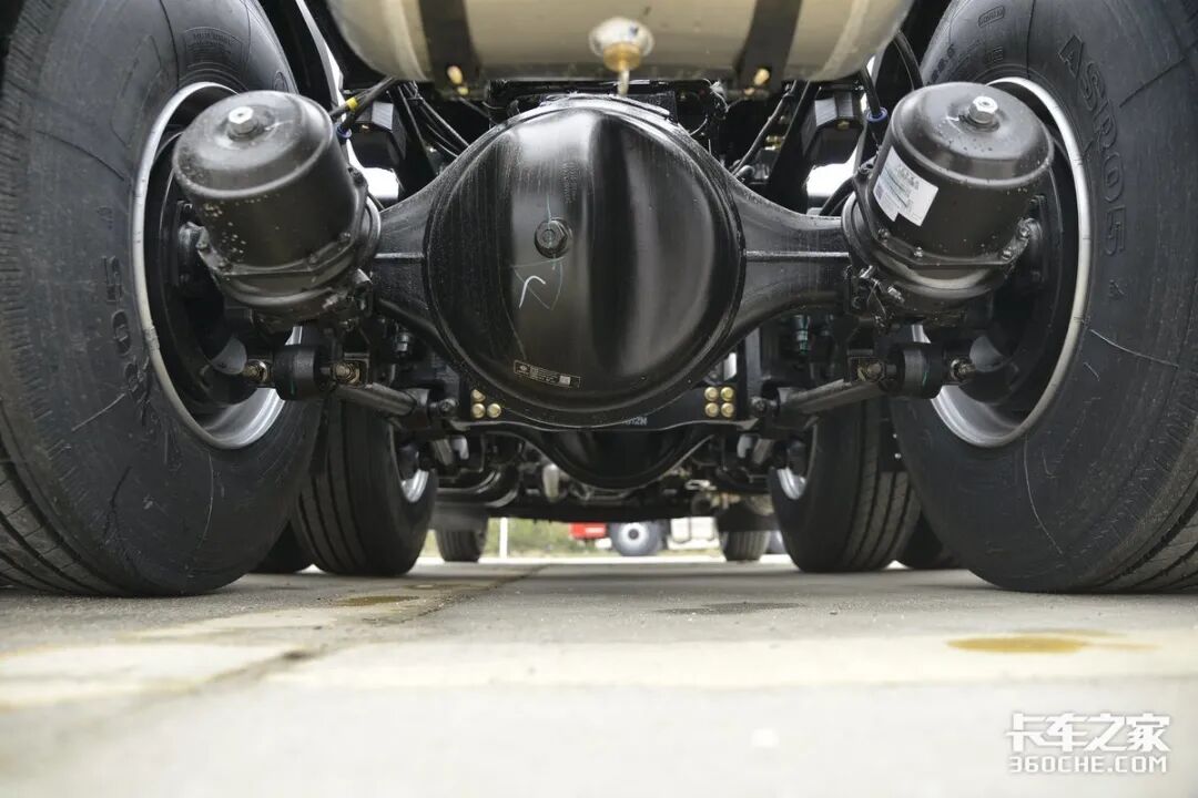 实拍车型采用全铝合金车轮、玲珑品牌轮胎、1000升油箱等配置。底盘方面,采用前后钢板悬架,后桥速比为3.38,总速比仅为2.6,经过卡车之家车速计算器模拟计算,在1000-1400rpm之间时,车辆平均车速可达73-103km/h,十分高效。
