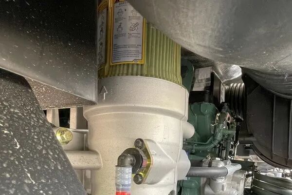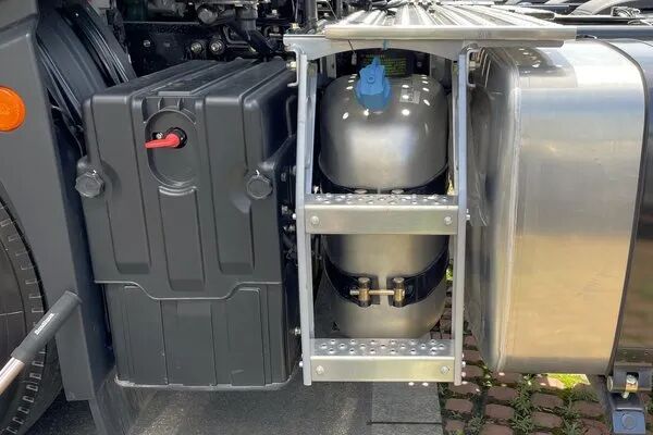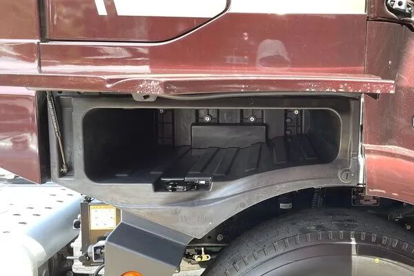 通过图片我们能够看出,在车辆的左右两侧各布置了一款铝合金油箱,初步推测整体的容量应该在1000升左右,对于满足车辆续航没有任何问题。