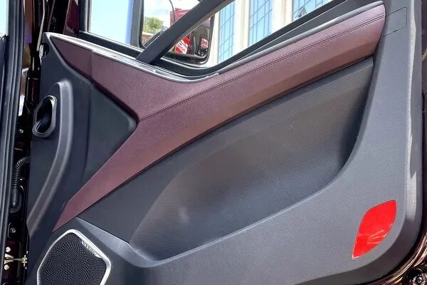打开车门能看到在车门的最下方新增了LED光源的迎宾灯,能够将咱们脚下的路照亮,方便上车,车辆内饰门板采用了全新的“Y”字形设计,搭配以酒红色的内饰配色和全新的扬声器造型,内饰门板的年轻程度甚至不亚于很多乘用车。