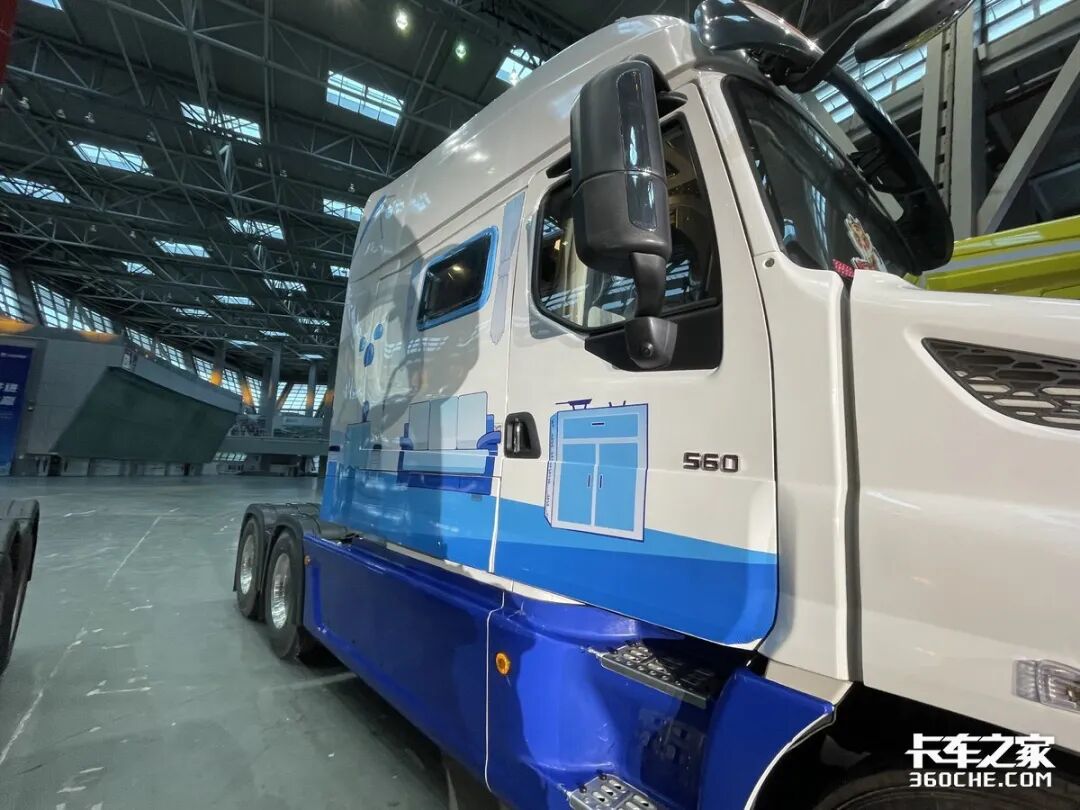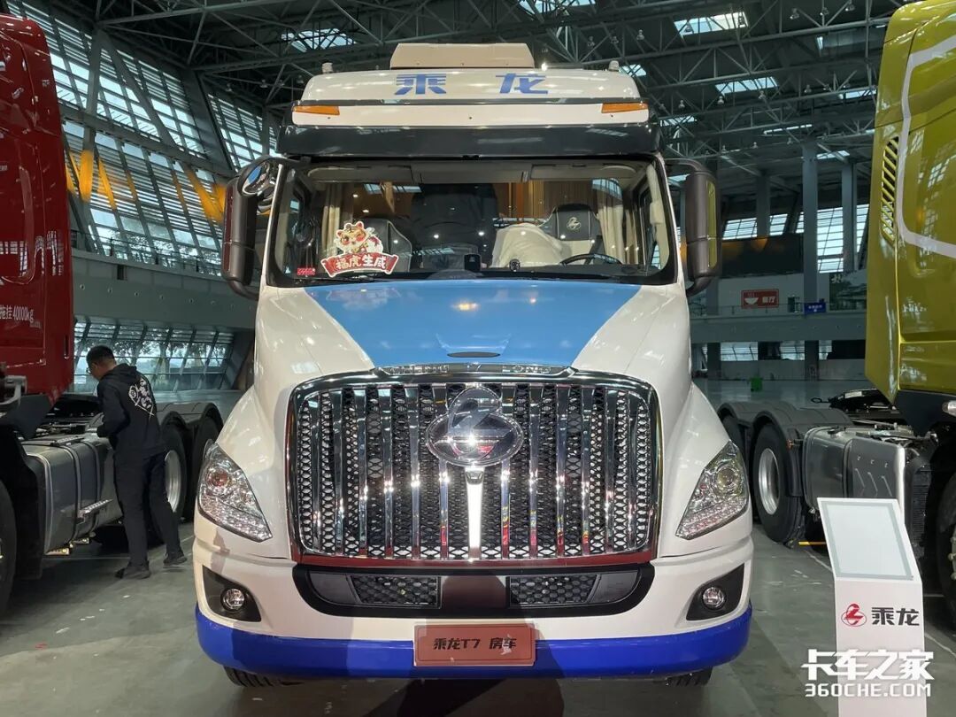美式长头驾驶室造型的T7,以珍珠白为主色,配以蓝色拉花点缀,在众多牵引车中尤其亮眼。前置引擎设计带来了流线型的迎风面,让整车风阻系数低至0.36,能获得更好的燃油经济性,省油效果显著。