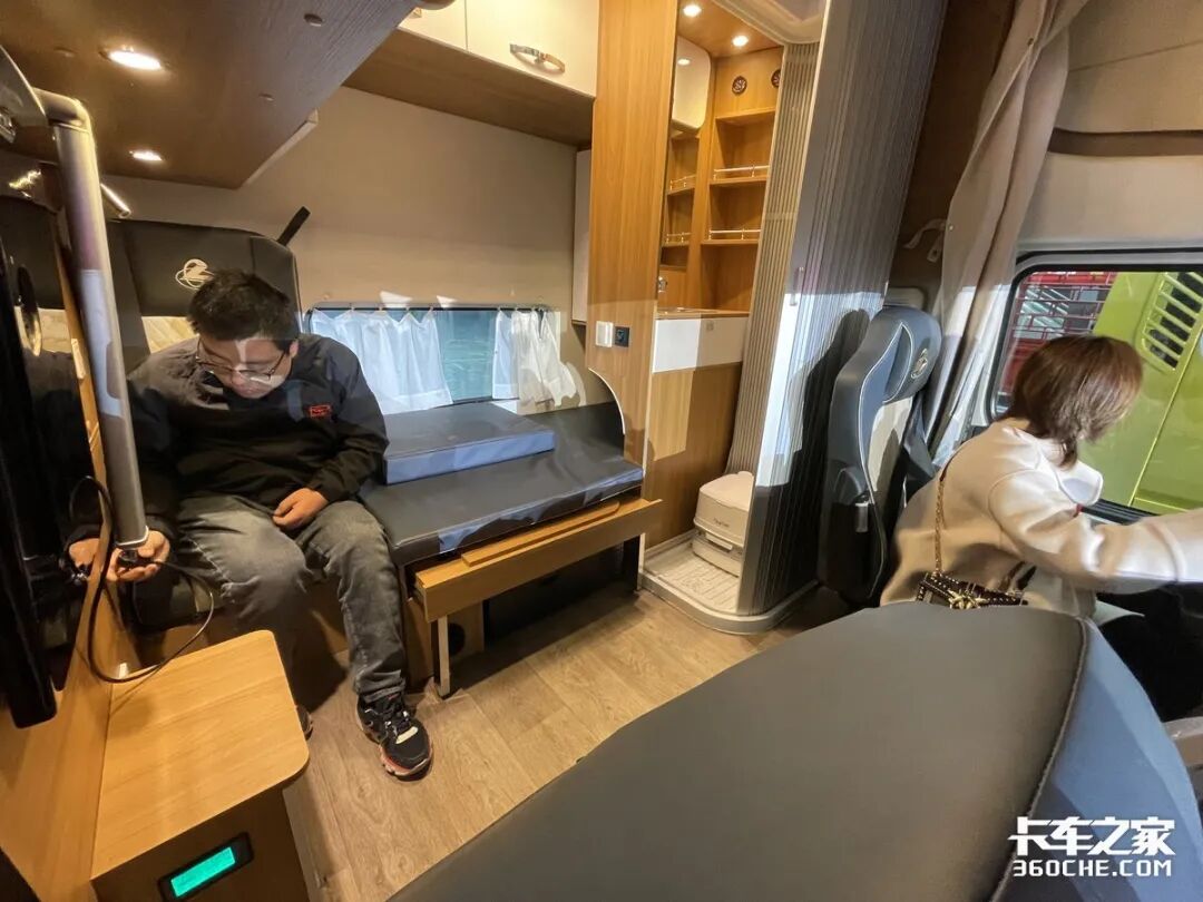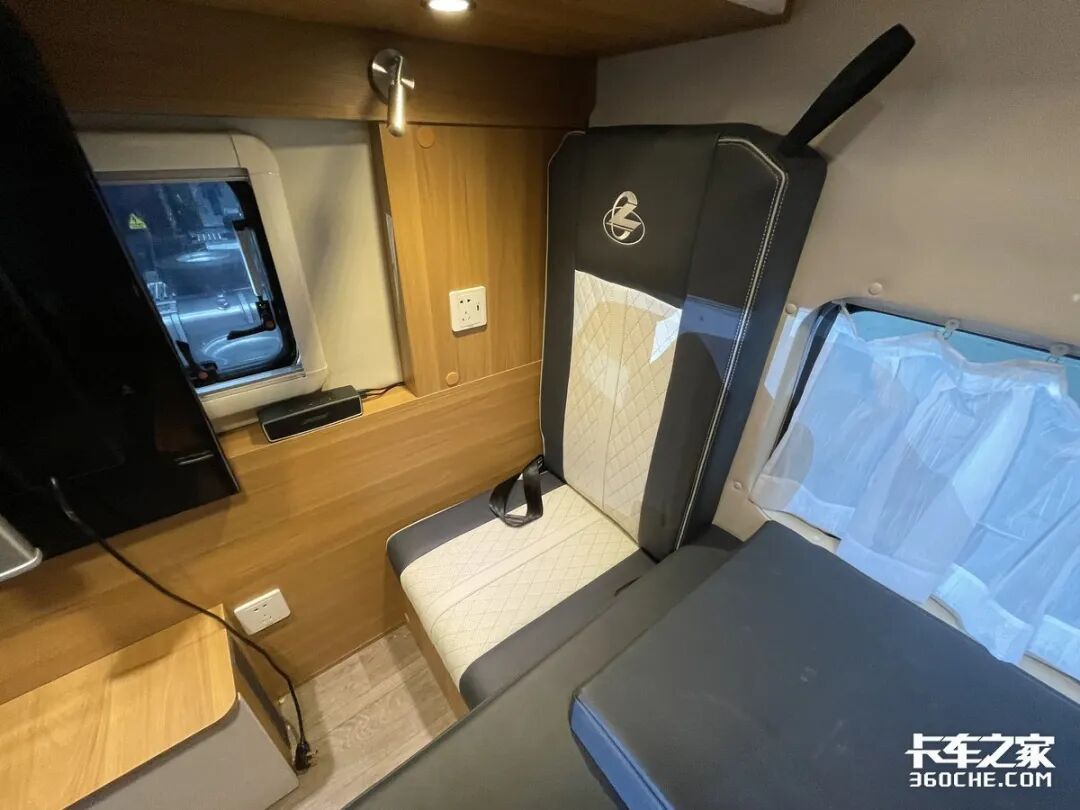 卧铺区域设置了第三个座椅,并配有安全带,在需要休息时可以将靠背放下,形成一个1.4米宽的豪华大床。此外,生活区搭载了多项家居化设备,驻车空调、车载电视、冰箱、热水器、电磁炉、微波炉等。在3000W逆变器和主副电瓶的加持下,完全满足家居用电需求,让运输旅途也像在家里一样舒适。