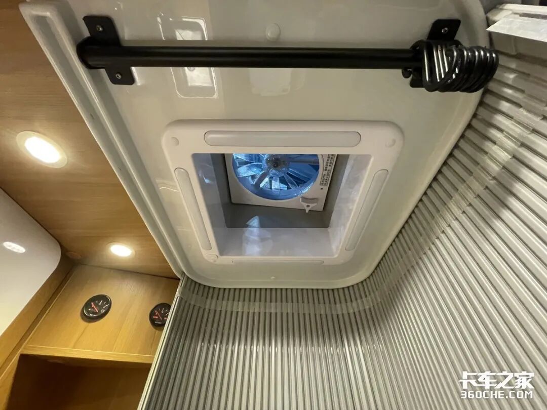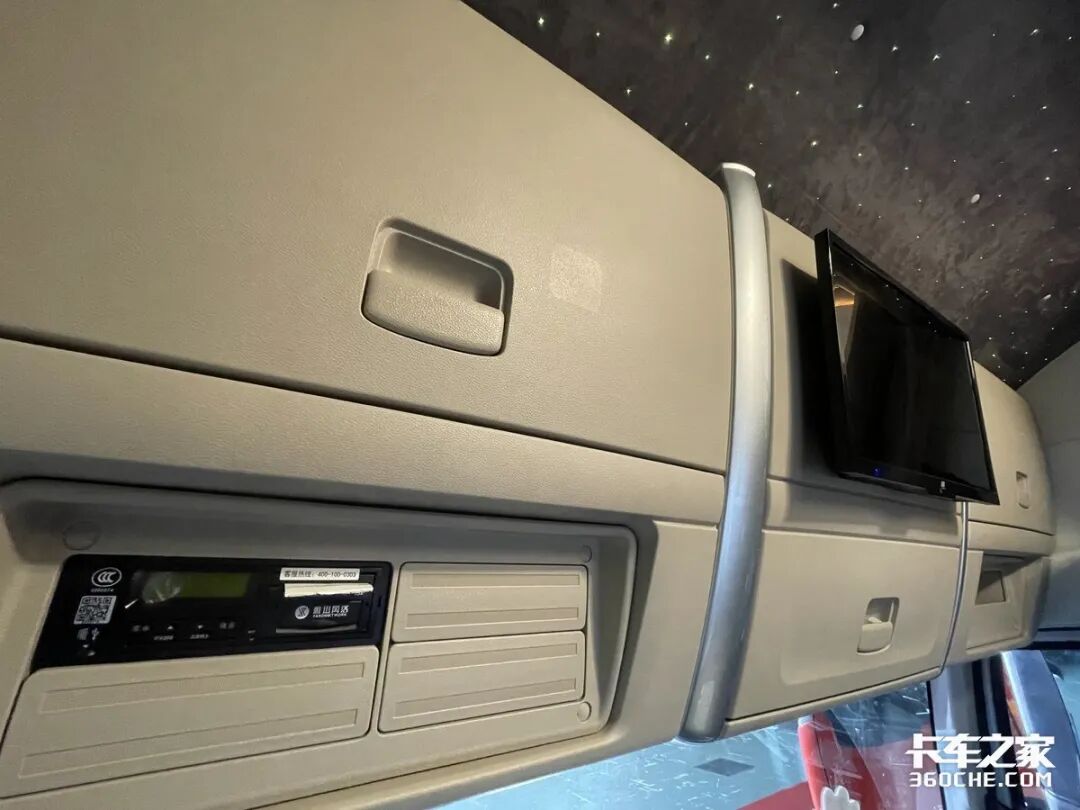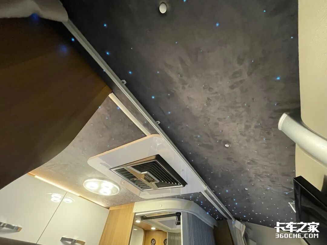 个人觉得,驾驶室内最令人惊喜的地方在车顶,竟然采用了星空顶的设计,这么美轮美奂的装饰在国内的卡车上属实少见。