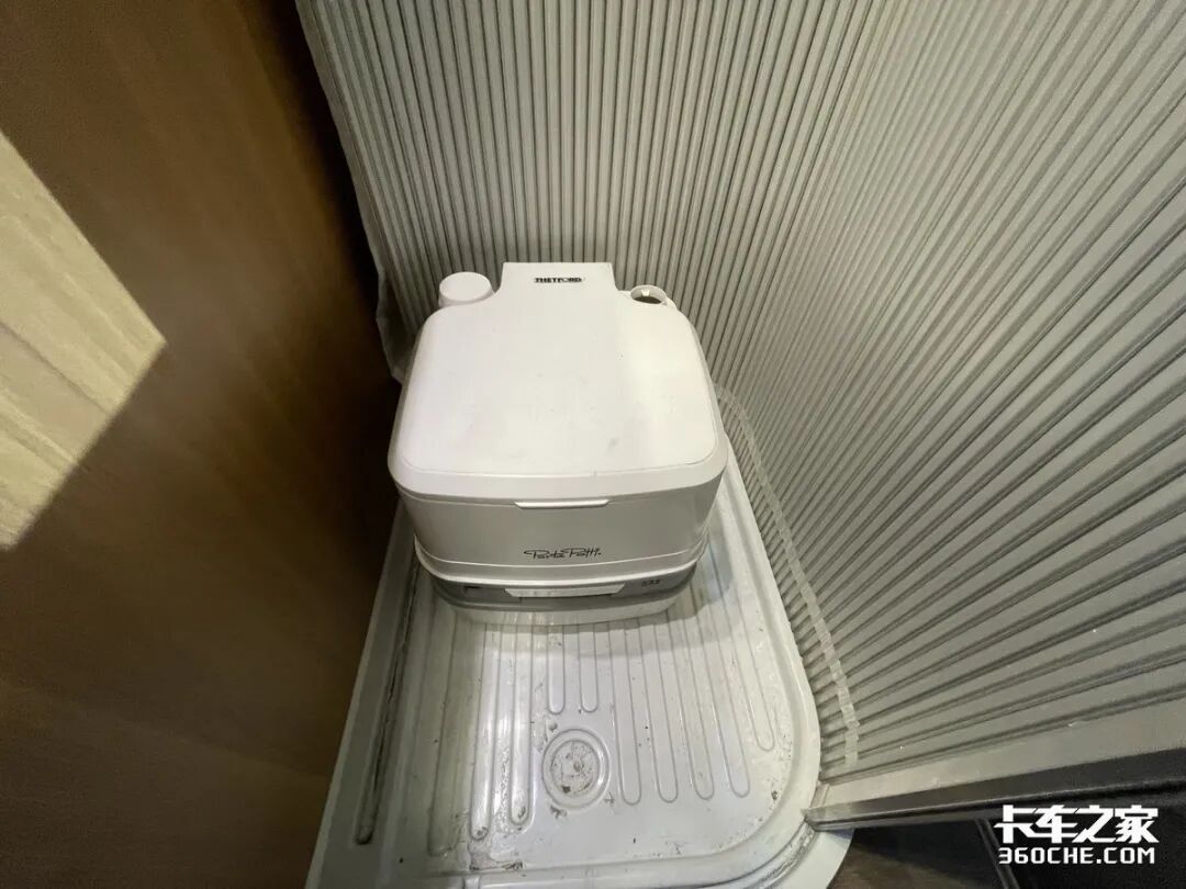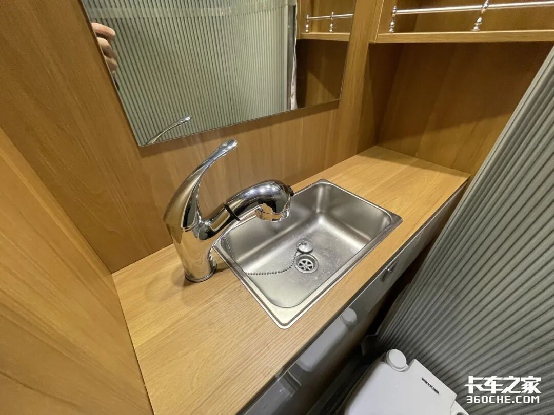 驾驶位的后方是一个独立的卫生间区域,配备了洗手池、花洒和便携式马桶,可在车内洗漱、淋浴以及上厕所,非常方便。上方的排气扇也能及时抽走异味,确保车内空气清新洁净。环绕式的可推拉折页门,能保证使用卫生间时的隐私性。