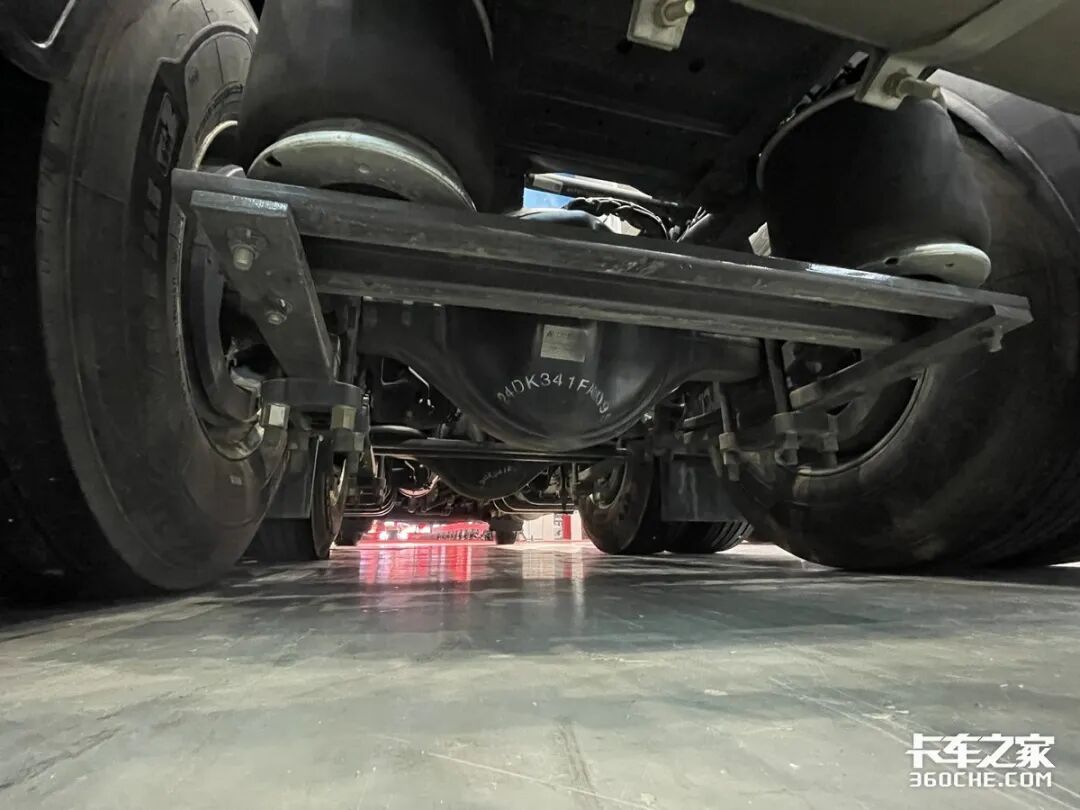 底盘方面,整车的轴距为4500+1350mm,前桥为153加强桥,使用少片簧设计,装配有康迈免维护轮端,换油里程达50万公里。后桥采用德纳440后桥,速比为3.417,寿命长达160万公里。