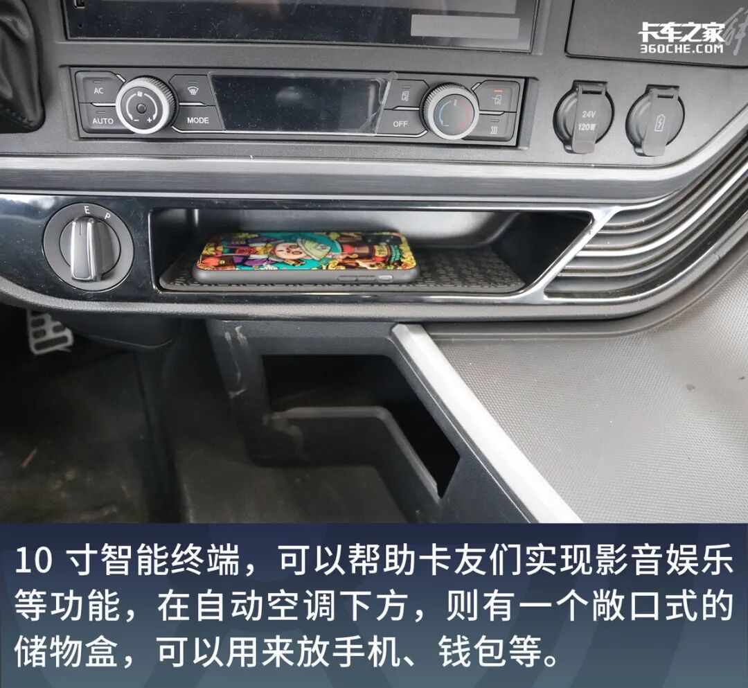 卡友们在停车间隙,如果想要放松身心,车上带有的10寸智能终端,可以帮助卡友们实现影音娱乐等功能,在自动空调下方,则有一个敞口式的储物盒,可以用来放手机、钱包等。