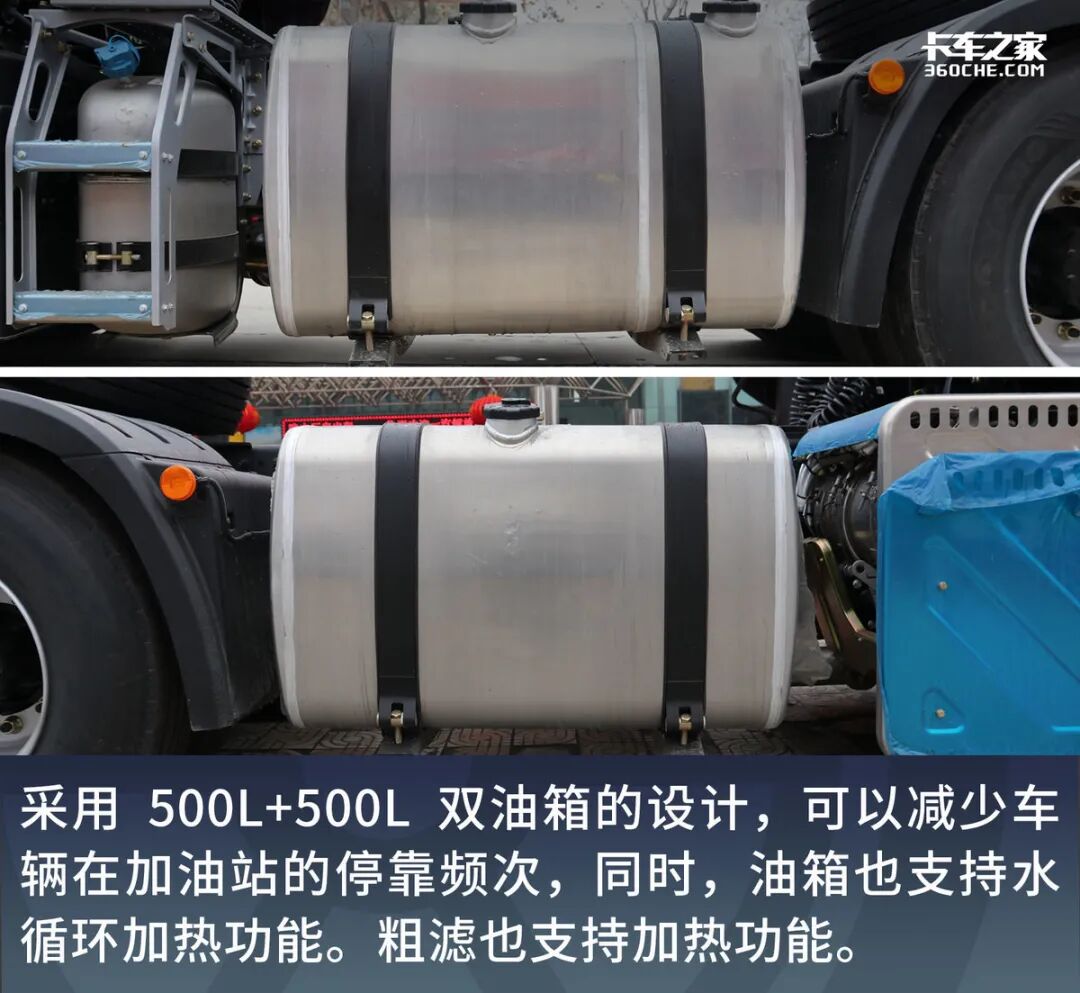 为了更进一步保证运输的时效,这款一汽解放J6V采用的是500L+500L双油箱的设计,可以减少车辆在加油站的停靠频次,同时,油箱也支持水循环加热功能。粗滤也支持加热功能。