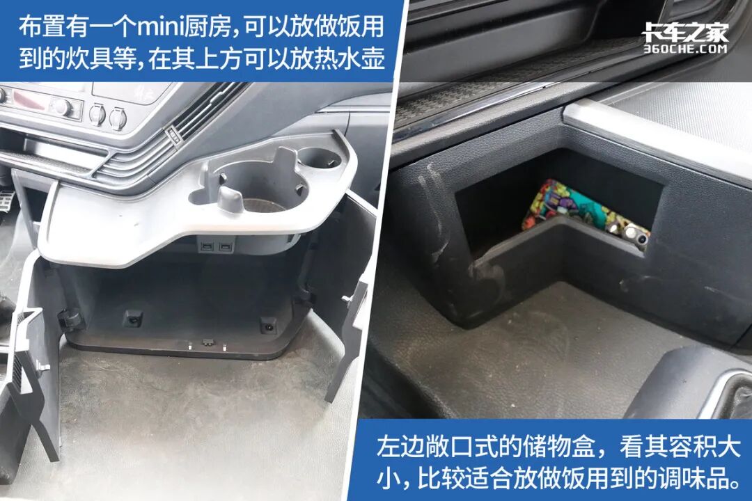 现在卡友们为了节省开支,基本都会在车上做饭,实拍车辆在中控台处,布置有一个mini厨房,可以放做饭用到的炊具等,在其上方可以放热水壶等,左边有一个敞口式的储物盒,看其容积大小,比较适合放做饭用到的调味品。