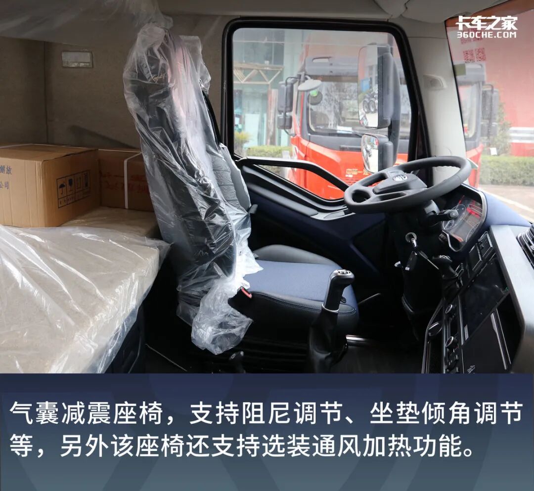 当卡友们在颠簸路面上行驶时,通过四点悬浮驾驶室以及气囊减震座椅,可以很好的降低车辆在通过这些路面时给卡友们带来的颠簸感,并且座椅也支持阻尼调节、坐垫倾角调节等,该座椅还支持选装通风加热功能。
