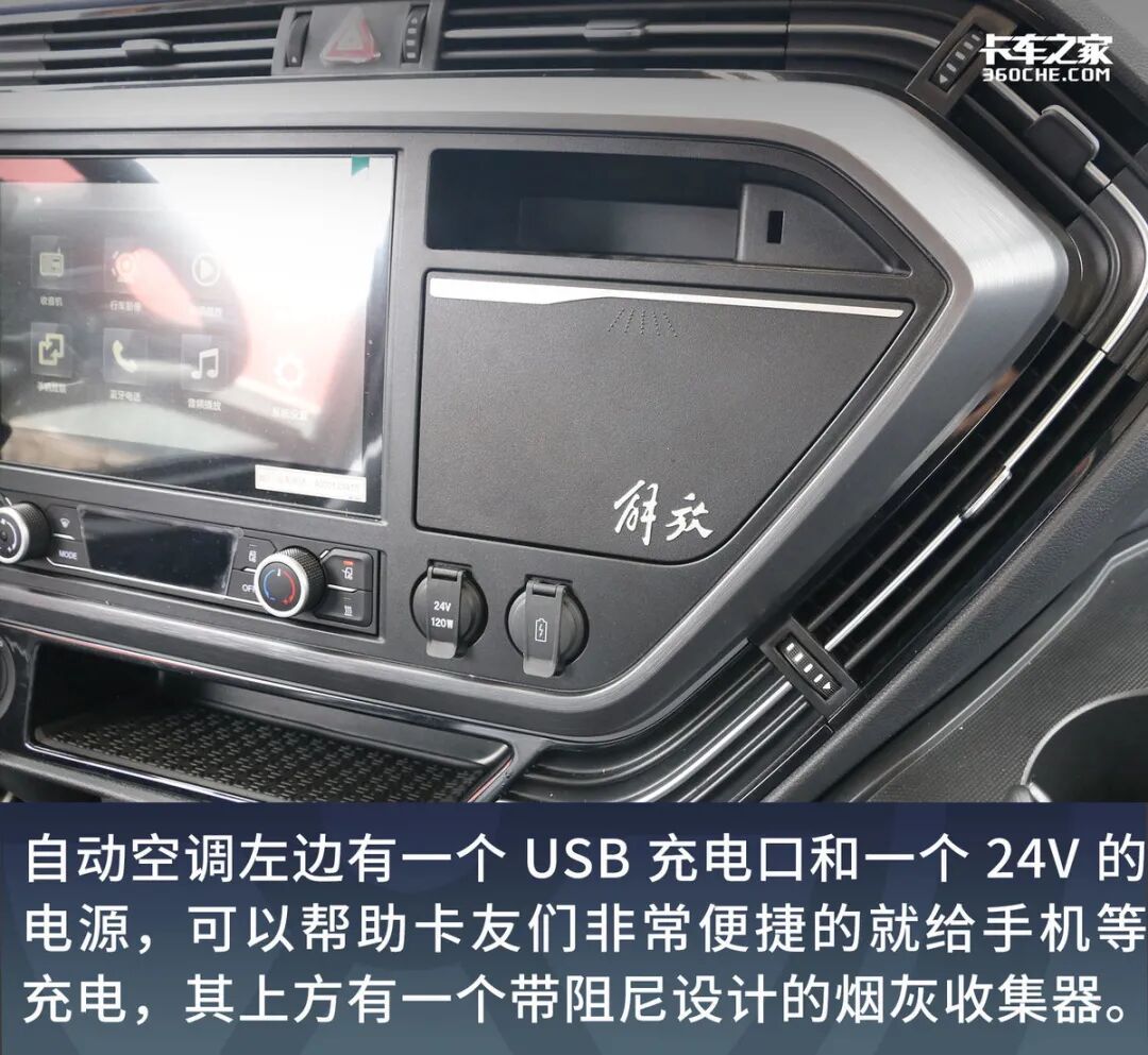 当在开车过程中发现手机等设备电量不足时,自动空调左边还有一个USB充电口和一个24V的电源,可以帮助卡友们非常便捷的就给手机等充电,其上方有一个带阻尼设计的烟灰收集器,可以避免烟灰洒落驾驶室。