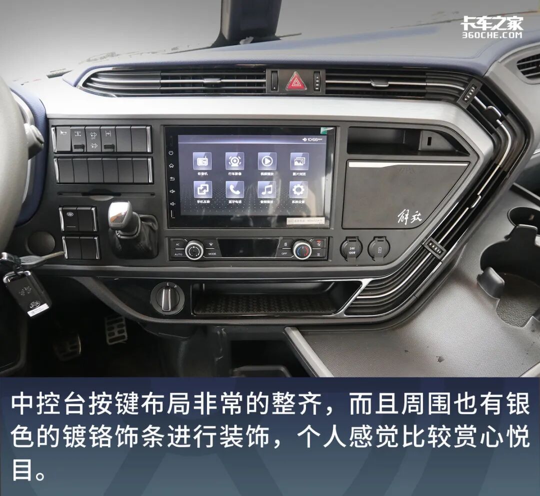 随着卡友越来越年轻化,精致的内饰更容易俘获卡友的芳心,这款解放J6V的中控台,按键布局非常的整齐,而且周围也有银色的镀铬饰条进行装饰,个人感觉比较赏心悦目。