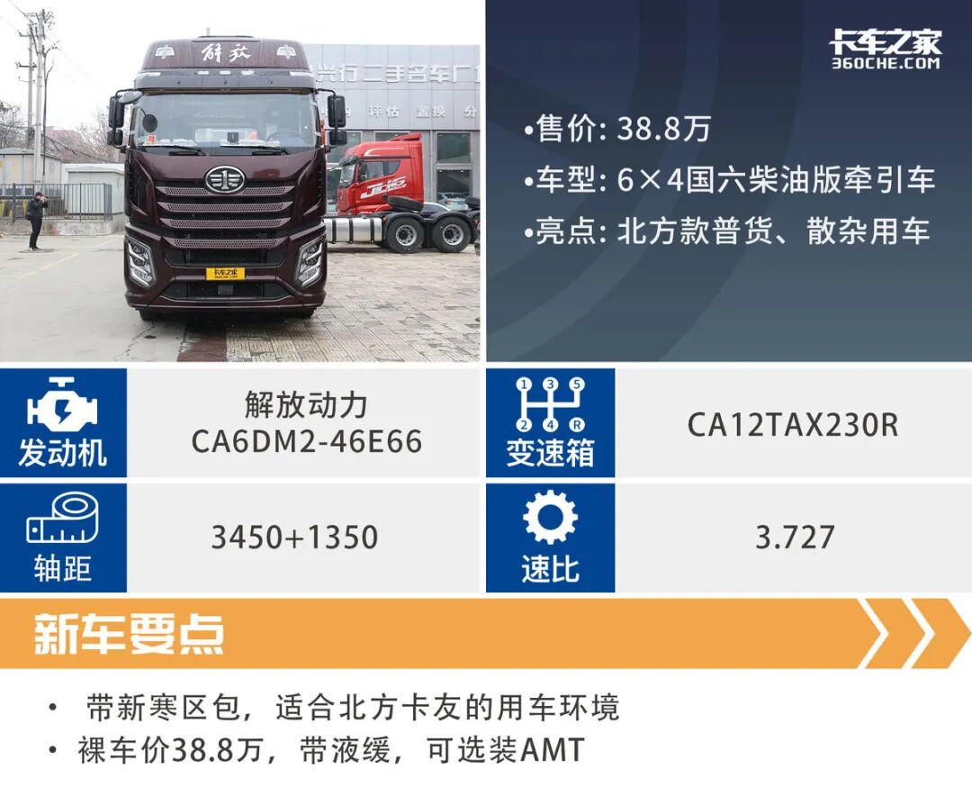针对卡友们的这种用车环境以及用车需求,如果购车预算在40万左右,那么可以看下这款一汽解放J6V 460马力北方款牵引车,可选AMT以及液缓,高顶大排半驾驶室,带有独立暖风、电加热卧铺等,陕西西安地区对此车的报价为38.8万。(视配置以及地区不同,经销商的报价可能存在差异,具体售价以经销商的回复为准。)