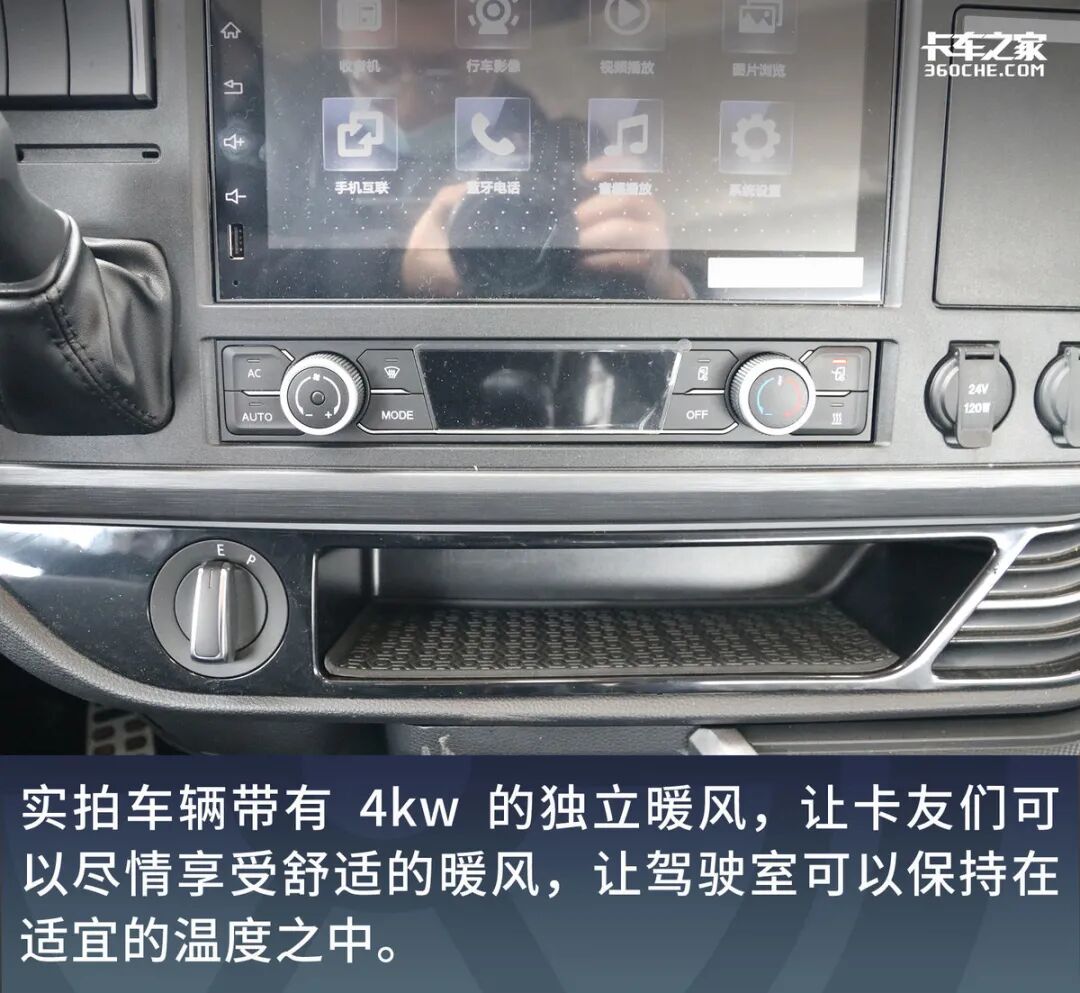 气温较低,卡友们在开车或者是休息时往往会冷的直打哆嗦,为了让卡友们能够在一个适宜的温度中开车,这款车带有4kw的独立暖风,让卡友们可以尽情享受舒适的暖风,不用担心冬天驾驶室的温度情况。
