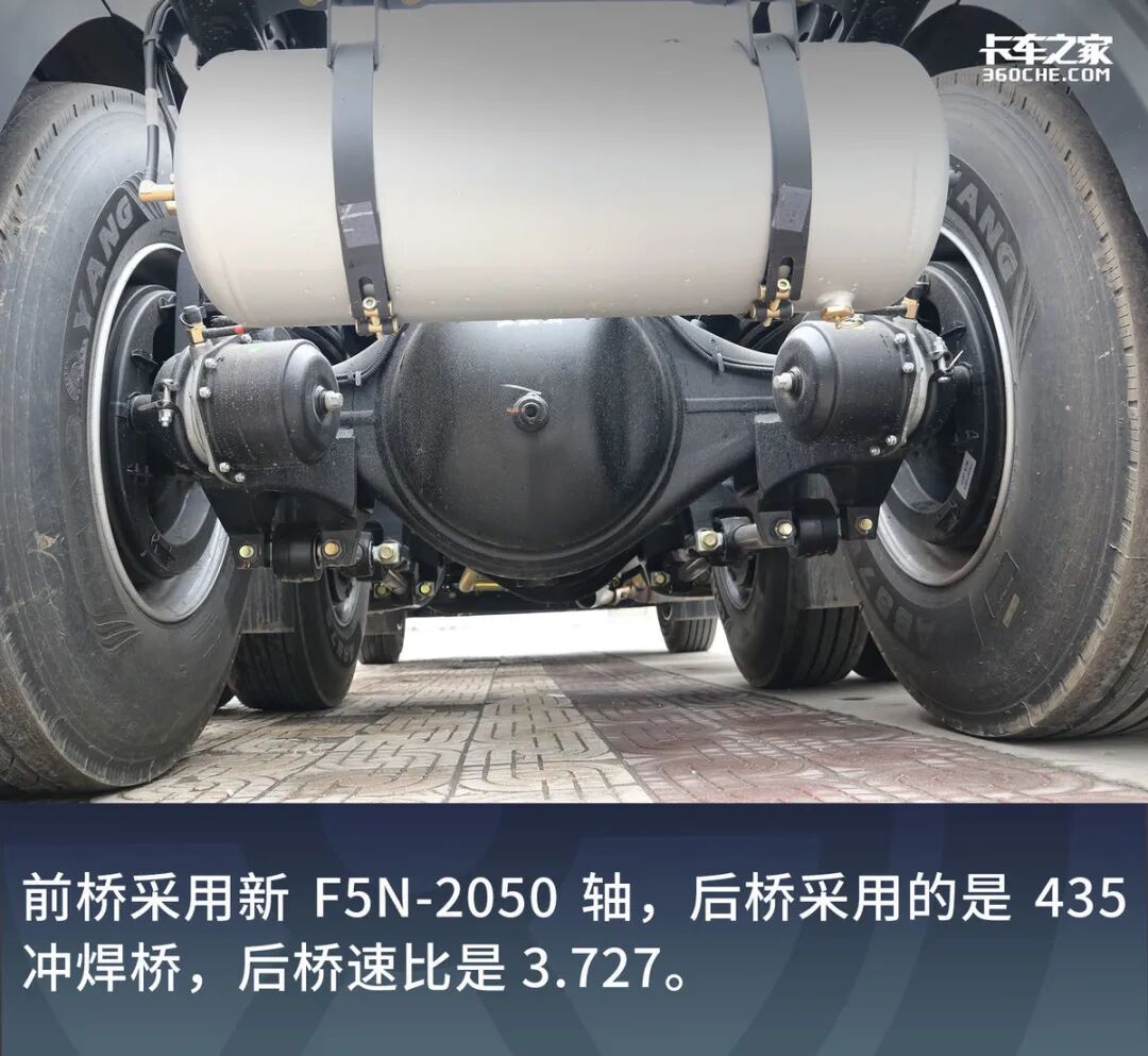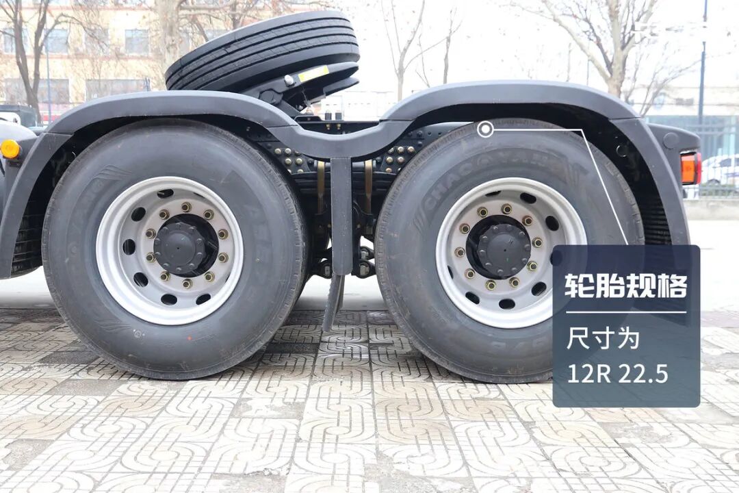 轮胎的使用规格是12R22.5,前轮配备的是铝合金轮圈,后轮配备的是轻量化轮圈。