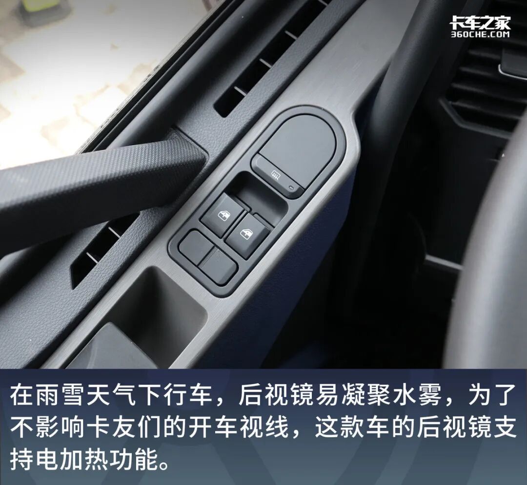 在雨雪天气下行车,后视镜容易凝聚水雾,为了不影响卡友们的开车视线,这款车的后视镜支持电加热功能,可以帮助卡友们处理后视镜上面凝聚的水雾。