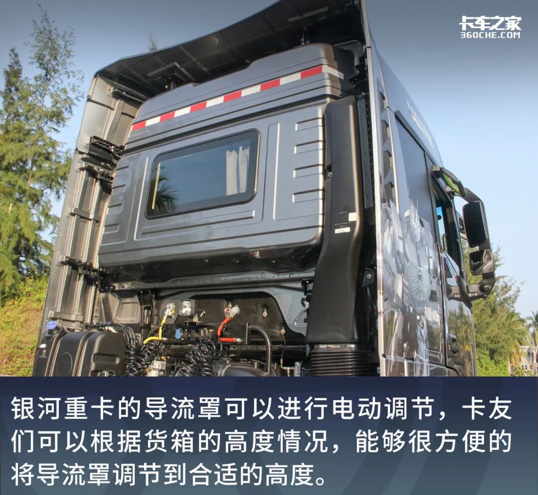 导流罩对降低风阻、降低油耗有一定的作用,银河重卡的导流罩可以进行电动调节,卡友们可以根据货箱的高度情况,能够很方便的将导流罩调节到合适的高度。