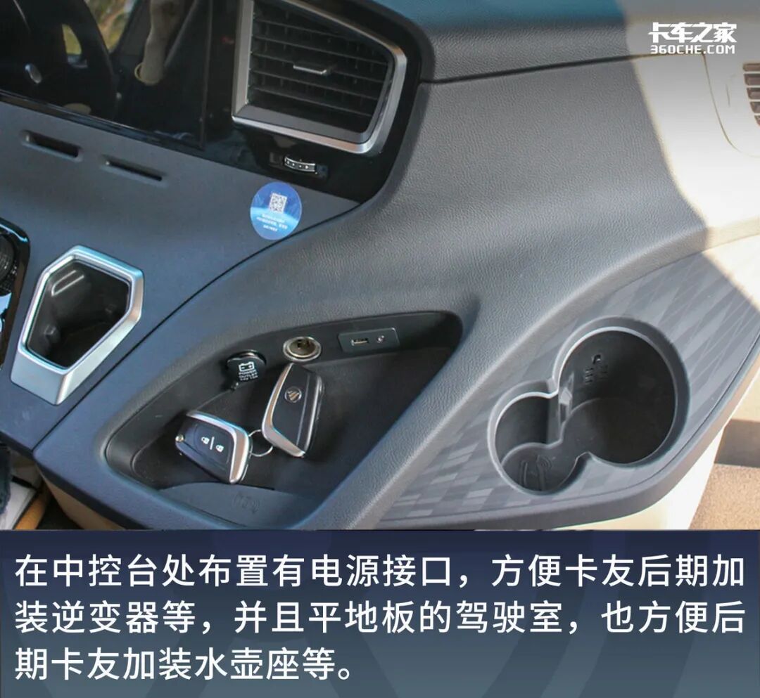 现在卡友们基本都喜欢给爱车加装电热壶,或者是直接在车上做饭,驾驶室会充当一部分厨房功能,在中控台处布置有电源接口,方便卡友后期加装逆变器等,并且平地板的驾驶室,也方便后期卡友加装水壶座等。该处也布置有手机无线充电功能。
