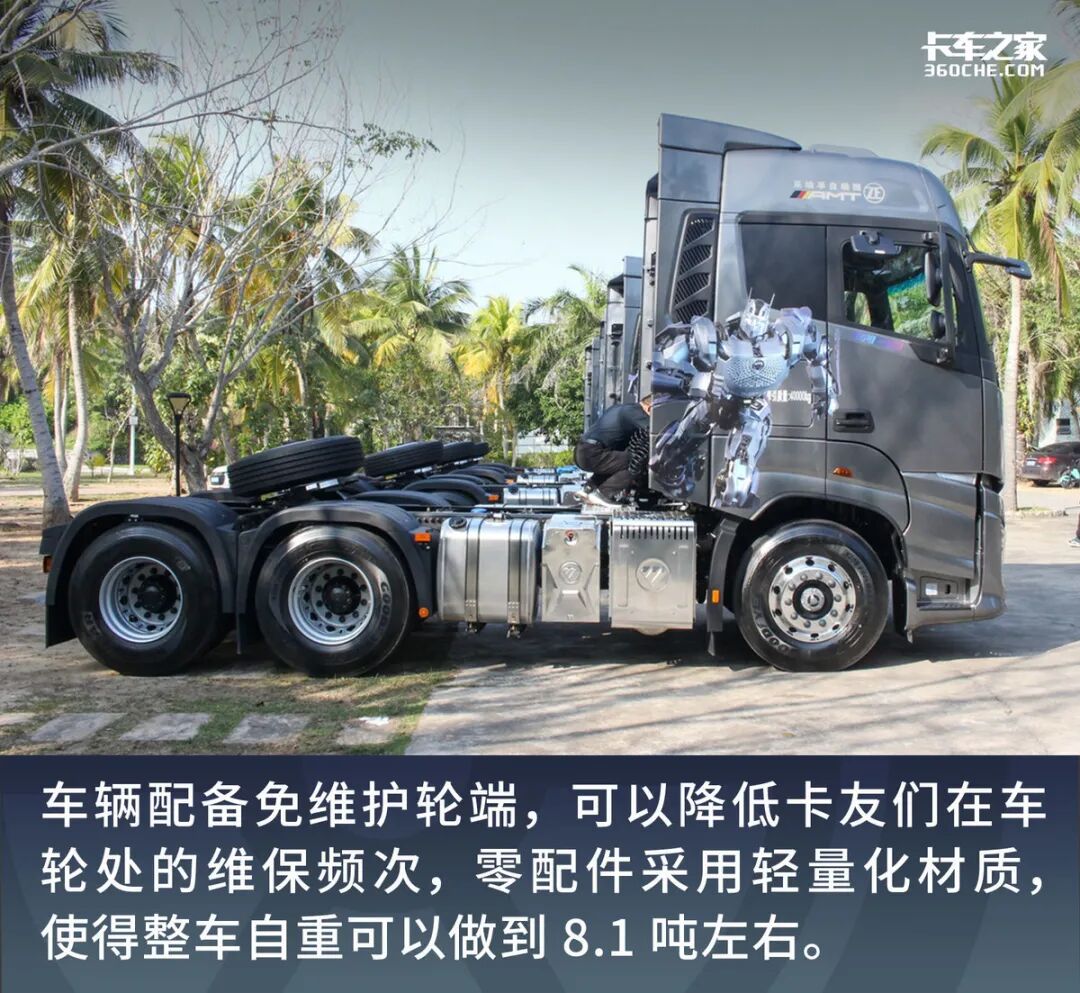 车辆配备免维护轮端,可以降低卡友们在车轮处的维保频次,而且铝合金油箱、铝合金储气筒等轻量化材质的使用,使得整车自重可以做到8.1吨左右,在标载化运输的今天,能够提高卡友们的单趟运营收益。