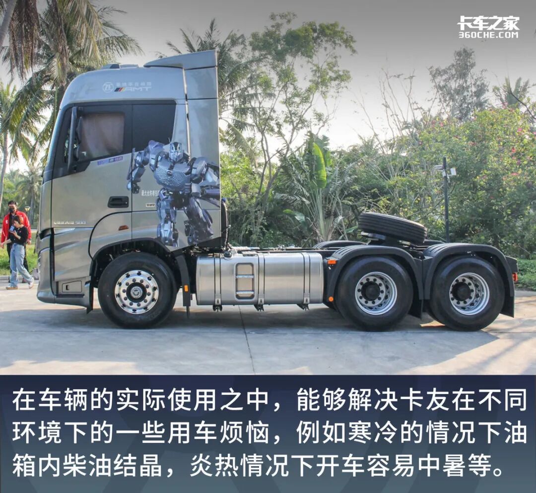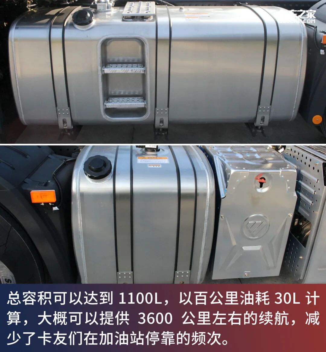 长途运输,对车辆油箱的续航能力以及周转效率有着较高的要求,实拍车辆采用的是双油箱的设计,总容积可以达到1100L,以百公里油耗30L计算,大概可以提供3600公里左右的续航,减少了卡友们在加油站停靠的频次。