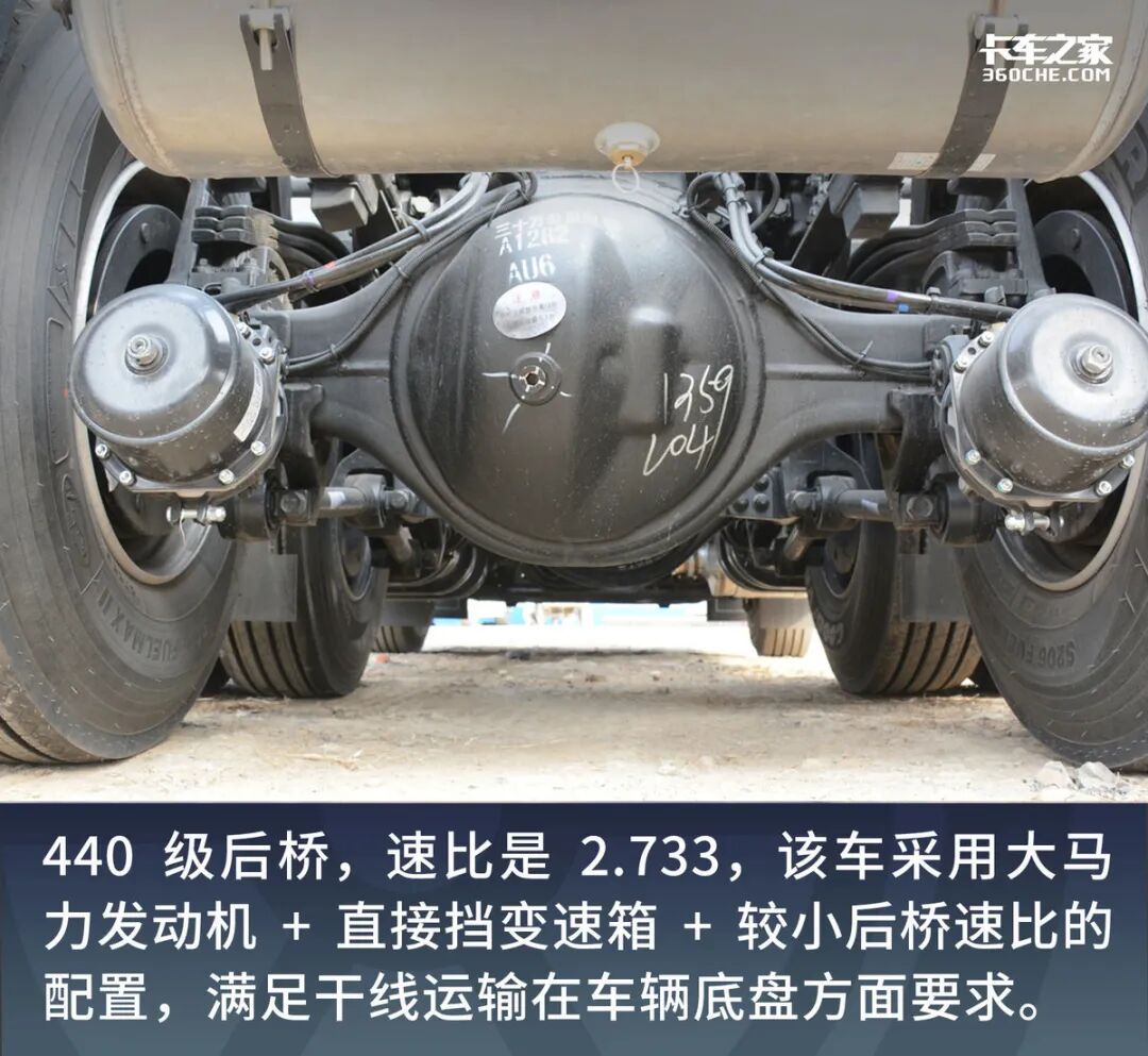 采用440级后桥,速比是2.733,该车采用大马力发动机+直接挡变速箱+较小后桥速比的配置,比较适合长途干线运输的运输工况,满足干线运输在车辆底盘方面的要求。
