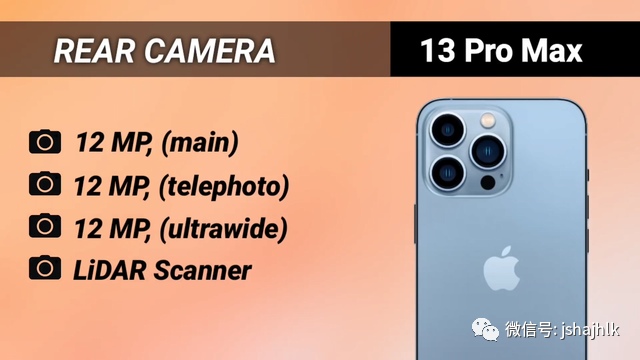 iPhone13ProMax搭载了三枚相机镜头和一枚LIDAR雷达极光扫描传感器,这三枚相机镜头的参数均为1200万像素。