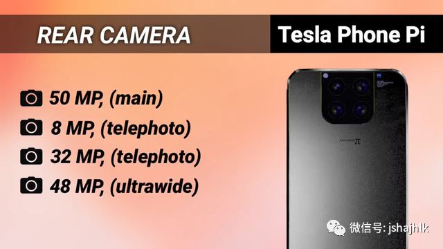 特斯拉手机π的相机镜头模组和传统的手机不同,位置是机身的正中间靠近顶部,搭载了四枚相机镜头,分别是5000万像素主摄,800万像素长焦,3200万像素长焦和4800万像素超广角,这四枚相机镜头的参数都比较高。