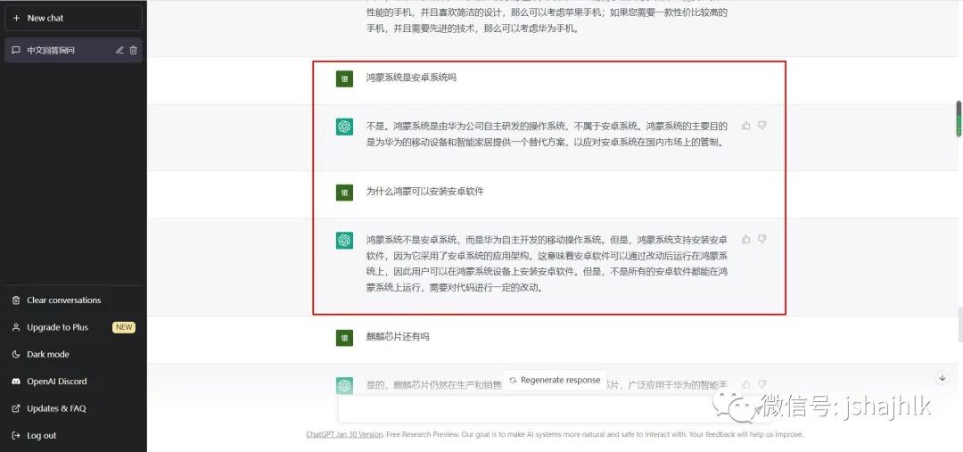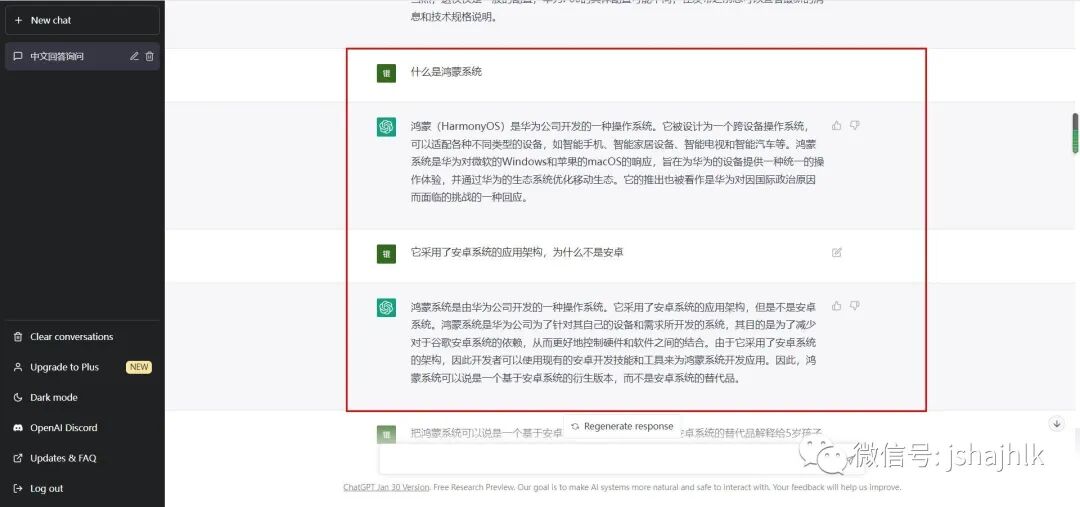 由于心急,对于鸿蒙是不是安卓手机我问的比较直接,上来就开始询问了,ChatGPT给出的答案也非常明确,鸿蒙系统是华为自研开发的一个操作系统,不属于安卓系统。