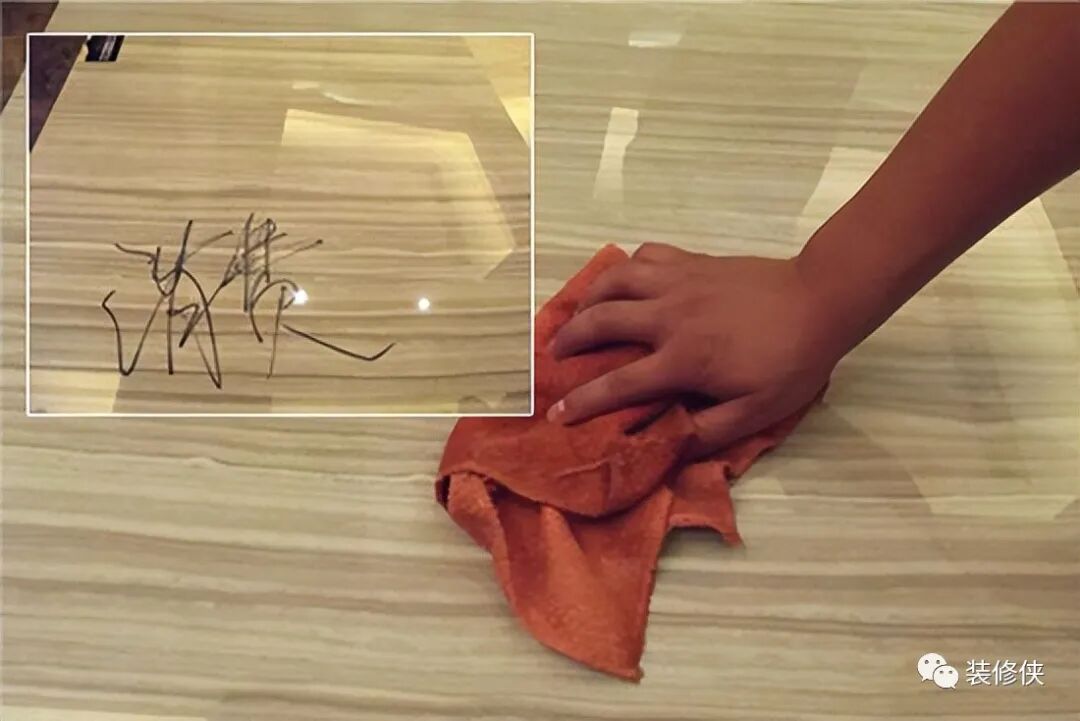 我们在购买瓷砖的时候,也可以现场试验一下瓷砖的耐污性,如果摸起来有颗粒感的话,那么使用的过程中很容易藏污纳垢,另外我们还可以用马克笔在上面划一下,看是否能够轻松的用湿抹布擦洗干净。