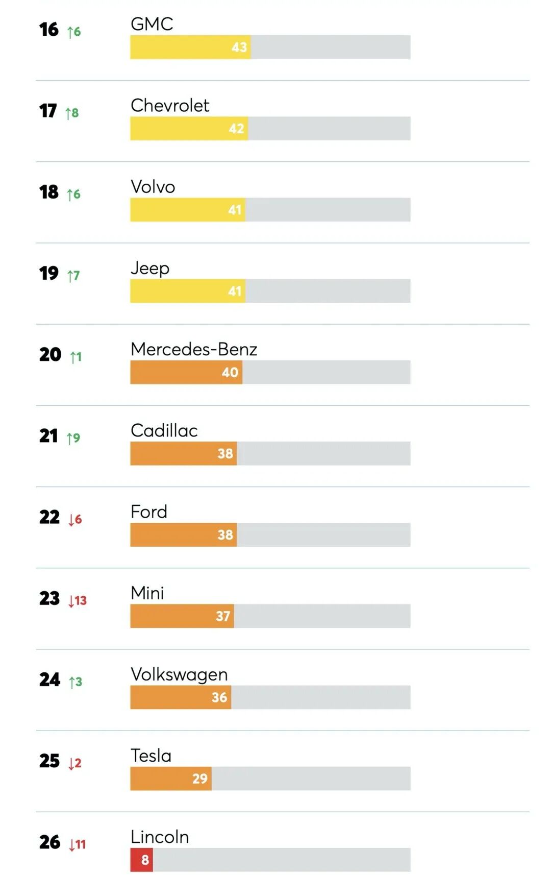 而排在倒数的分别是大众、特斯拉以及林肯这三个品牌。