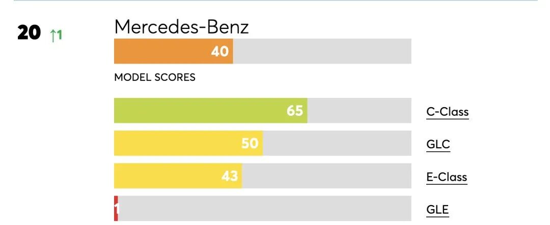 以大家都很关心的奔驰为例,奔驰的C-Class作为品牌中可靠性最佳的车型,其得分也仅仅是勉强及格,而排在最后的中大型SUV GLE的得分甚至只有可怜的1分......