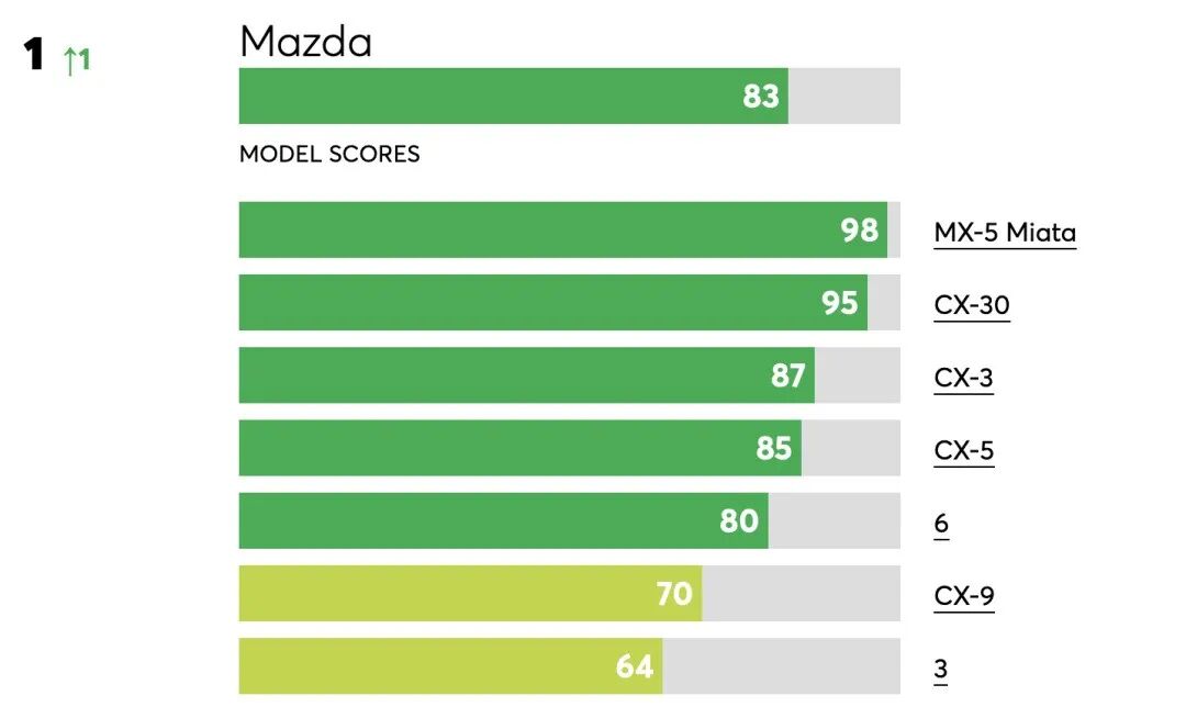 而相反,一举实现登顶的马自达,全系车型的表现都比较的稳定,其中小跑车MX-5的得分最高,这其实不难理解,毕竟愿意花钱买这类偏向于玩乐性质车型的人,本身一定是对该车有独特喜好的,口碑好自然是肯定的。至于口碑得分只有64分的马3则是马自达品牌中排名最靠后的车型。