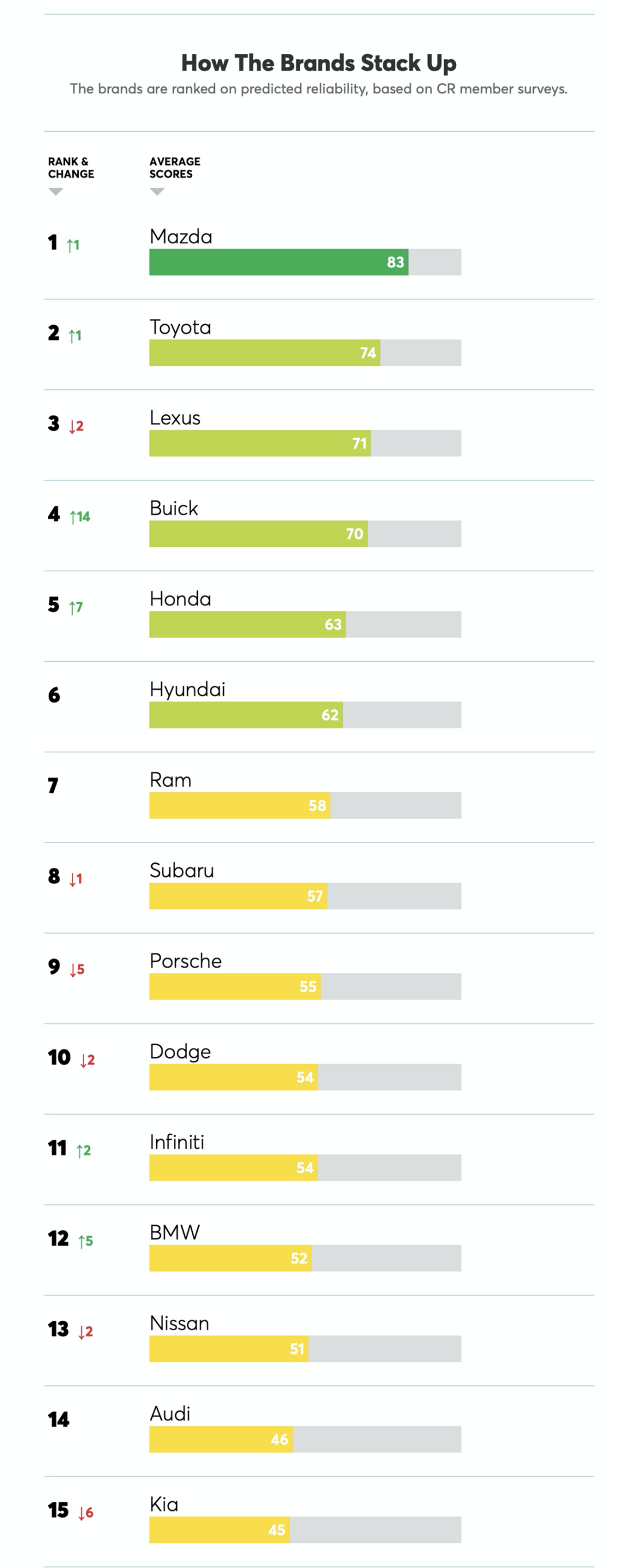 作为业内权威性最高的评测机构,美国的《消费者报告》在许多领域,尤其是汽车领域的排行榜一直以来都备受关注。而就在近日,《消费者报告》公布了最新一期的汽车品牌可靠性排行榜,以及各个品牌最可靠和最不可靠的车型。