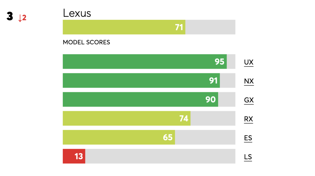而雷克萨斯之所以今年排名下跌,主要的“锅”还是在于其旗舰车型LS在用户中的口碑突然变差,根据详细报告,雷克萨斯口碑最好的车型为新推出小型SUV——UX系列,得分高达95,而相比之下旗舰轿车LS的得分却仅有13分,最为一个在中国全进口销售的品牌,这个车系排名或多或少也能反映雷车在国内的质量表现。
