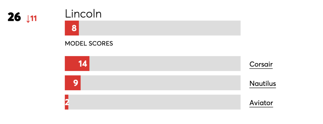 在砍掉了轿车业务以后,林肯品牌的总体质量出现了较大的下滑,冒险家、航海家以及飞行家这三款主销车型的得分都低到令人发指的地步,我甚至怀疑,国产化后的林肯会不会比美国本土的林肯质量更好呢?