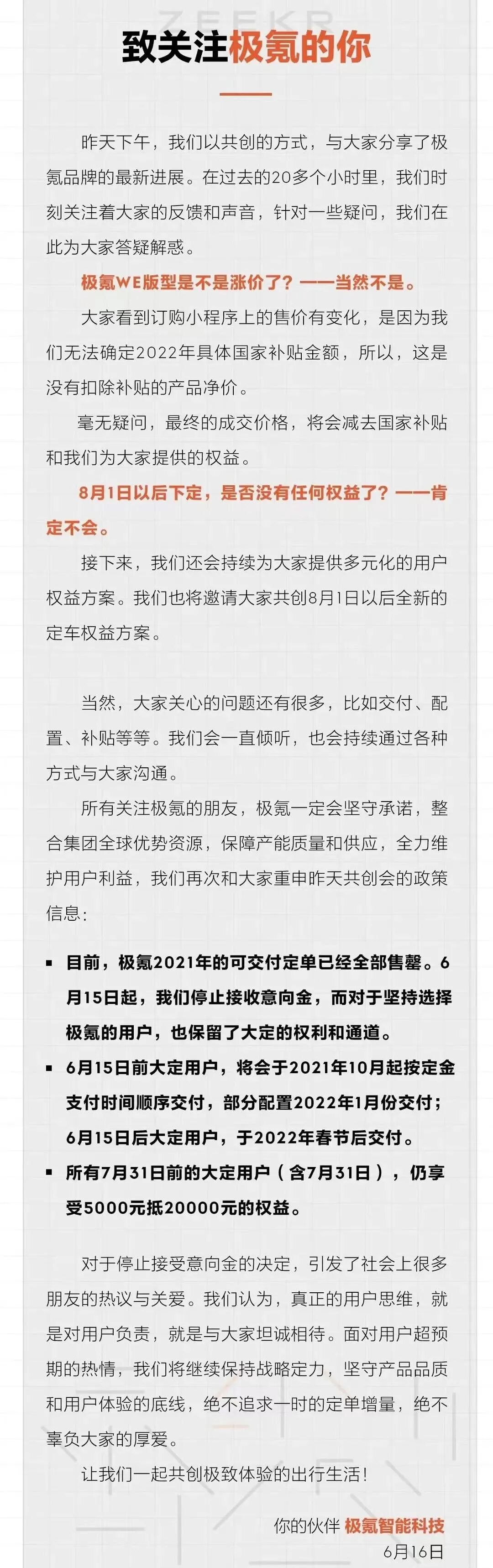 因此在6月16日,极氪官方发布了一份声明,除了解答了几个用户疑惑以外,还宣布了由于2021年的可交付订单已经售罄,从6月15日起已经停止接受意向金,虽然消费者依旧可以通过“大定”(不可退)的方式订车,但是交付日期将会延后至2022年的春节以后。