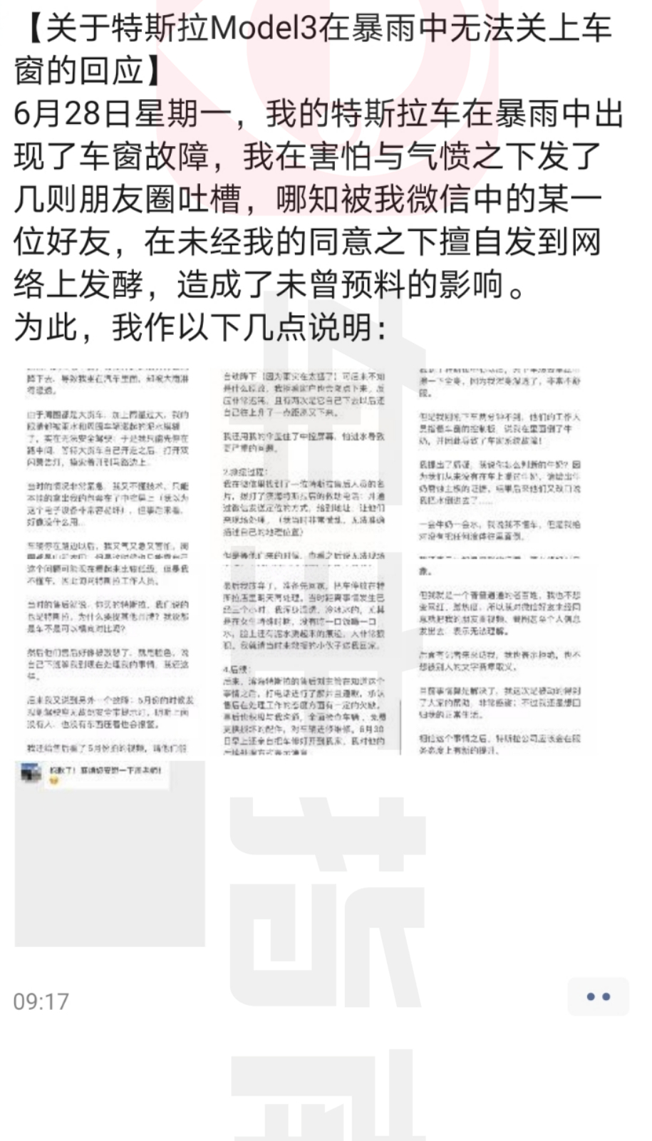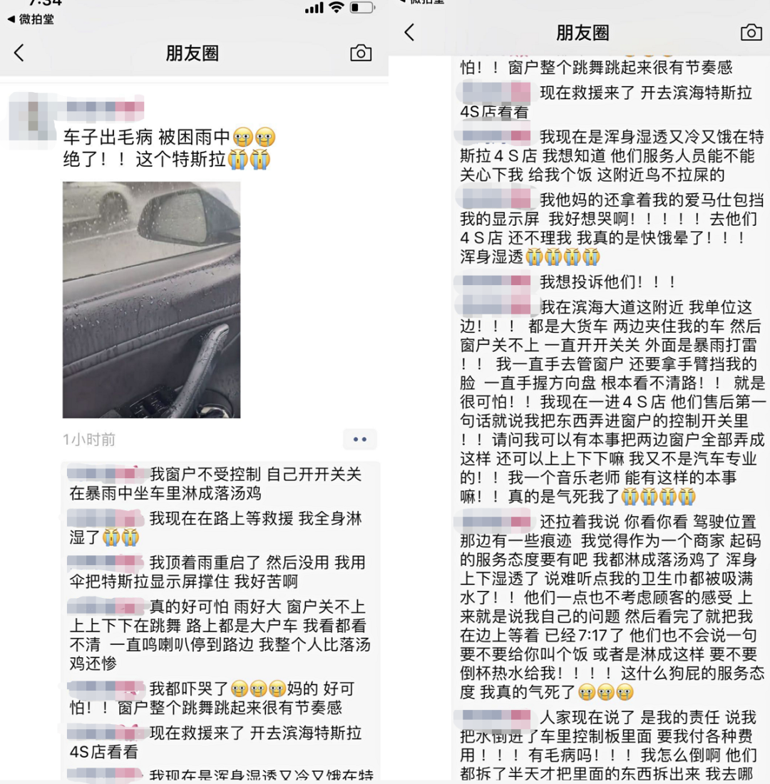 日前,网络上流传出一段视频和两张朋友圈截图,一位特斯拉女车主的Model 3车窗在暴雨天行车途中突然不受控制,自主下降。女车主发朋友圈吐槽后,被微信好友截图发到网络上引起热议。